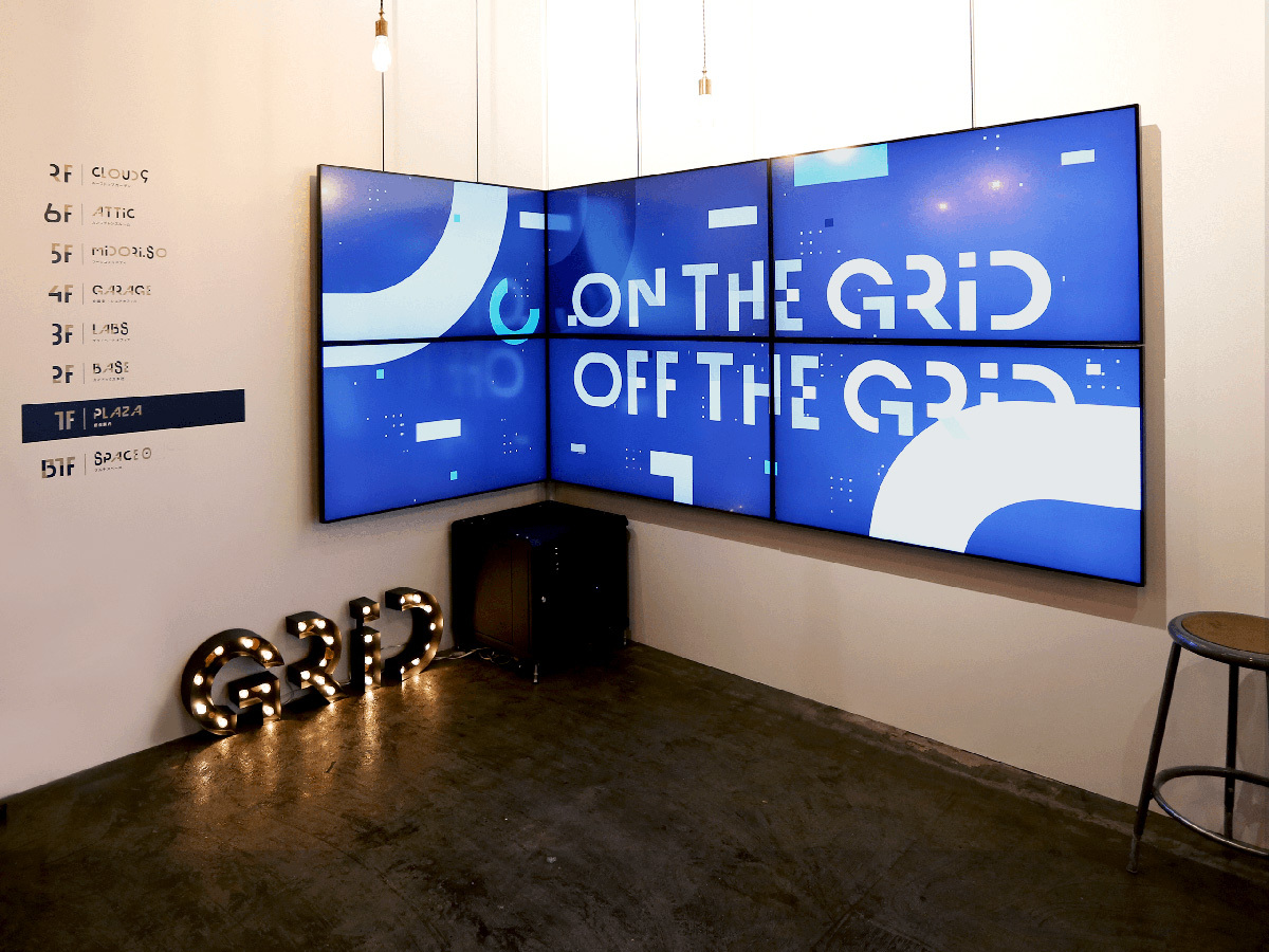 GRIDは、Gaiaxの新しい自社ビルを、新しいコミュニティースペースとして、日本におけるシェアリングエコノミーの核となるスペースにしたいという想いで生まれた。 NEWPEACE Inc.では、ビジョン・ネーミング・ロゴ・フォント・WEBサイト・ビルのエントランスやフラッグのサインデザイン・イベントを表示するVWALLを制作。「日本で一番シェアを体験できるビル」としてPRを行い、 2017年2月24日に行われたオープニングパーティーでは、ビル全体でトークショーなどのイベントが行われ、1700人が来場する反響を呼んだ。