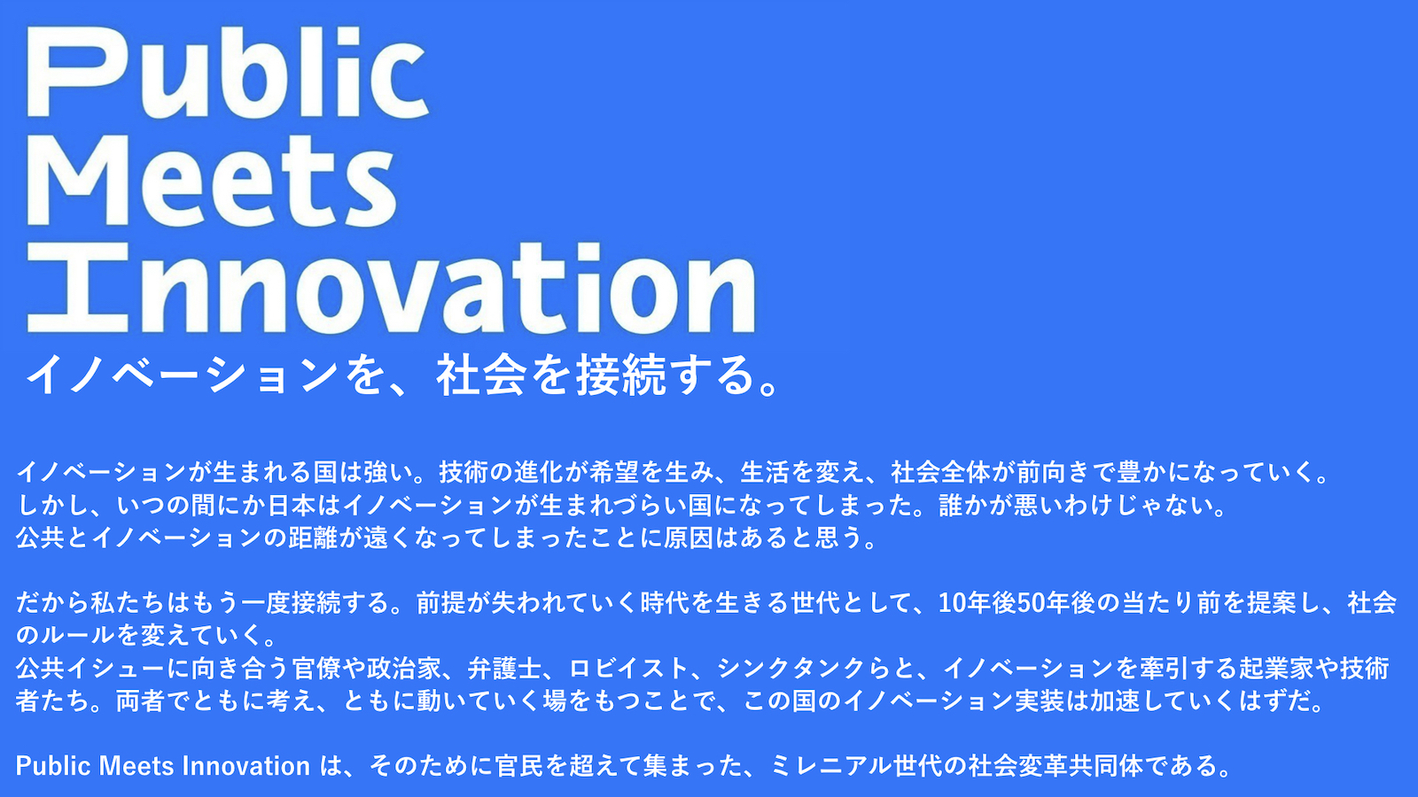 人工知能(AI)やブロックチェーン技術がグローバル規模で急速に進展する昨今、イノベーションに対する法整備・政策への重要度が増す一方で、日本のイノベーション政策を推進する環境整備は世界的に遅れている。この原因は「パブリック・セクターと若い世代のイノベーターとの相互接点の欠落」との考えのもと、パブリックセクター(官僚・政治家・弁護士・政策関係者等)とイノベーター(スタートアップやベンチャー経営者、テクノロジー技術者等)がフラットな立場でつながり、交流・相談・議論・コラボレーションが生まれるコミュニティの構築を目指す社団法人を設立。