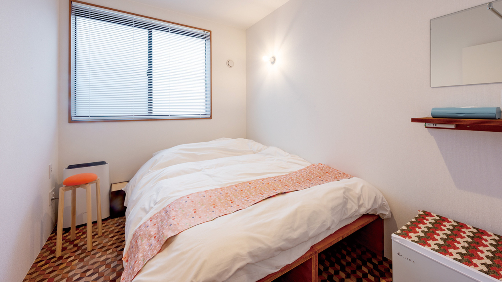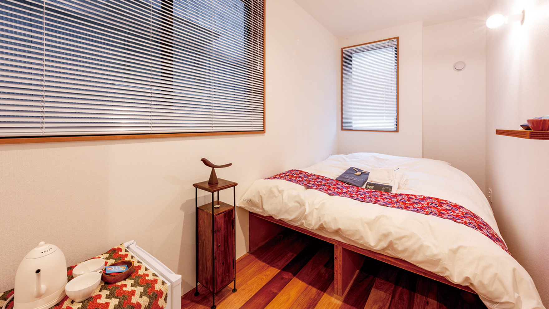 この上質なカリン材は『Plat hostel keikyu asakusa karin』のフローリング材としてふんだんに使用しております。もちろんフローリングのデザインにもこだわっており、通常デザインの他にもモザイクフローリングなどを活用することで各部屋ごとに異なる特徴を持たせています。