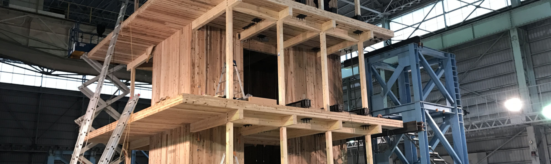 躯体CLTパネルには通常の接合金物に加え、錘固定治具や倒壊防止治具など様々な実験治具が取り付きます。