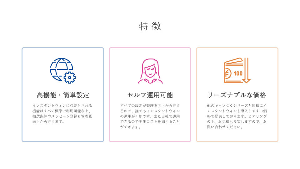インスタントウィンが管理画面で簡単に実施でき、すべての設定がセルフ運用できるのがキャンつく for インスタントウィンの特徴です。