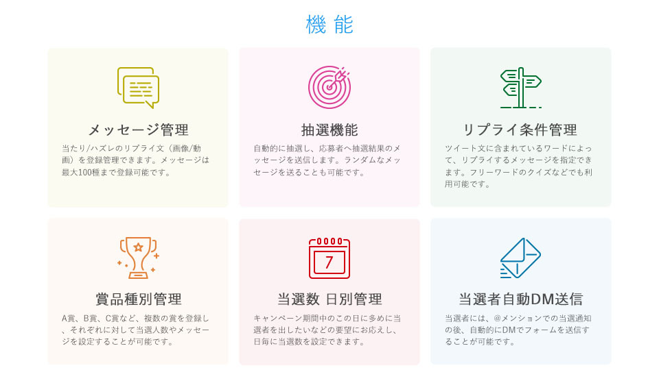 様々な条件によるリプライ文なども簡単設定。高機能なのに導入しやすい価格で提供しております。インスタントウィンに必要とされる機能はすべて標準で利用可能な上、抽選条件やメッセージ登録も管理画面上から行えます。
