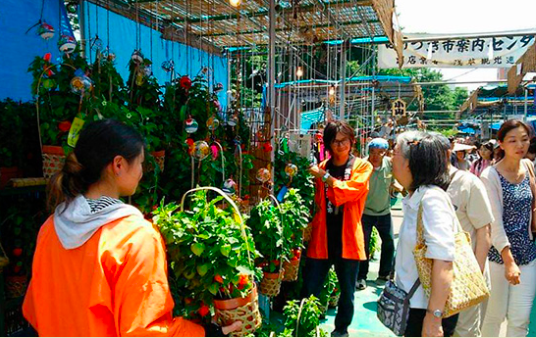ほおずき市で販売されるほおずきは、鉢の下に風鈴が吊り下げられ、だんだんと朱く色付いていく“ほおずき”を愛でながら、風鈴の涼やかな音色とともに日本の夏を感じていただける。日本の季節を五感で楽しむ魅力があります。