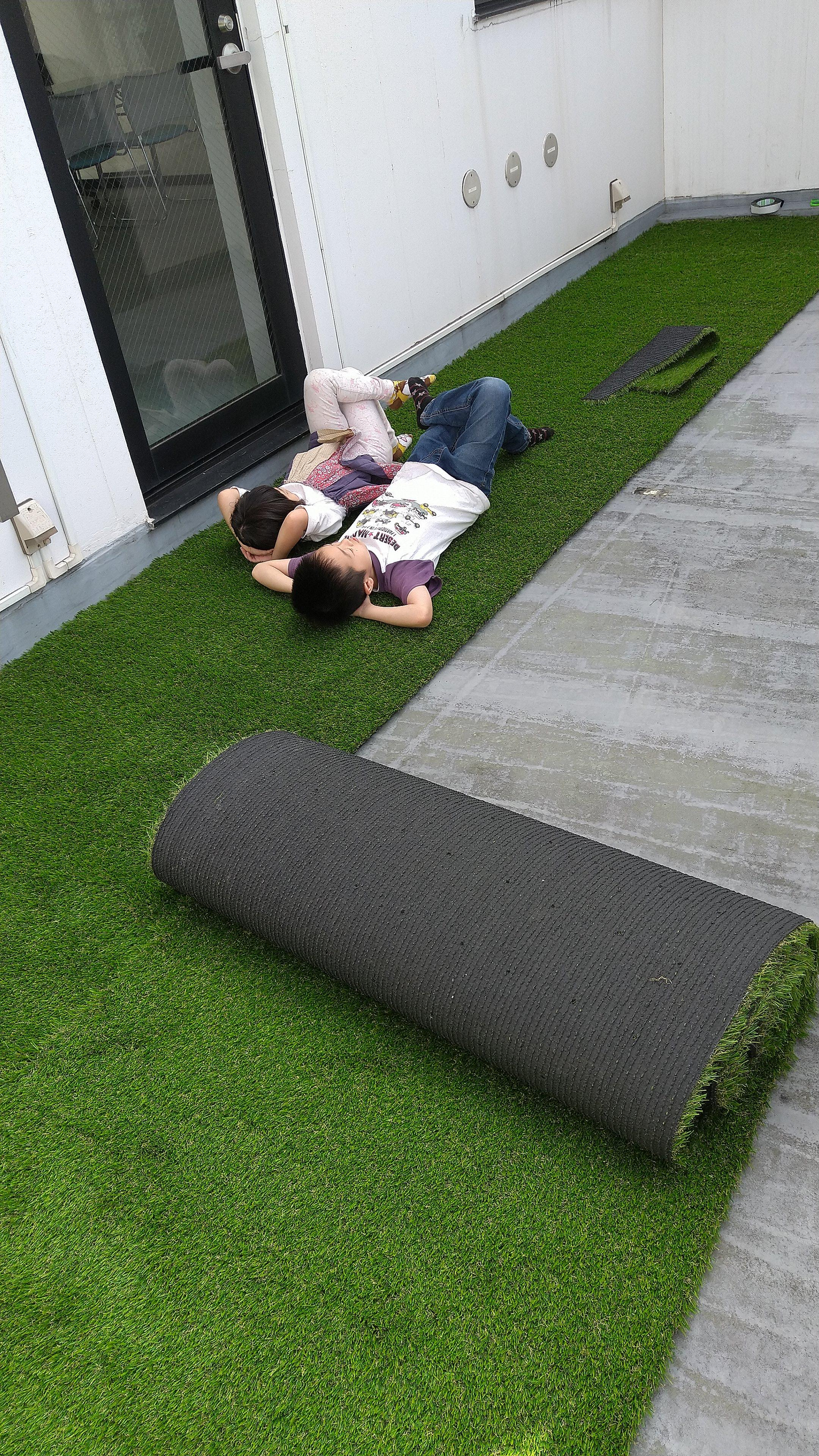 少しでも快適に使ってもらえるように休日にいつもの恒例で、子供たちを動員してオフィスの清掃と人工芝の敷設を行いました。