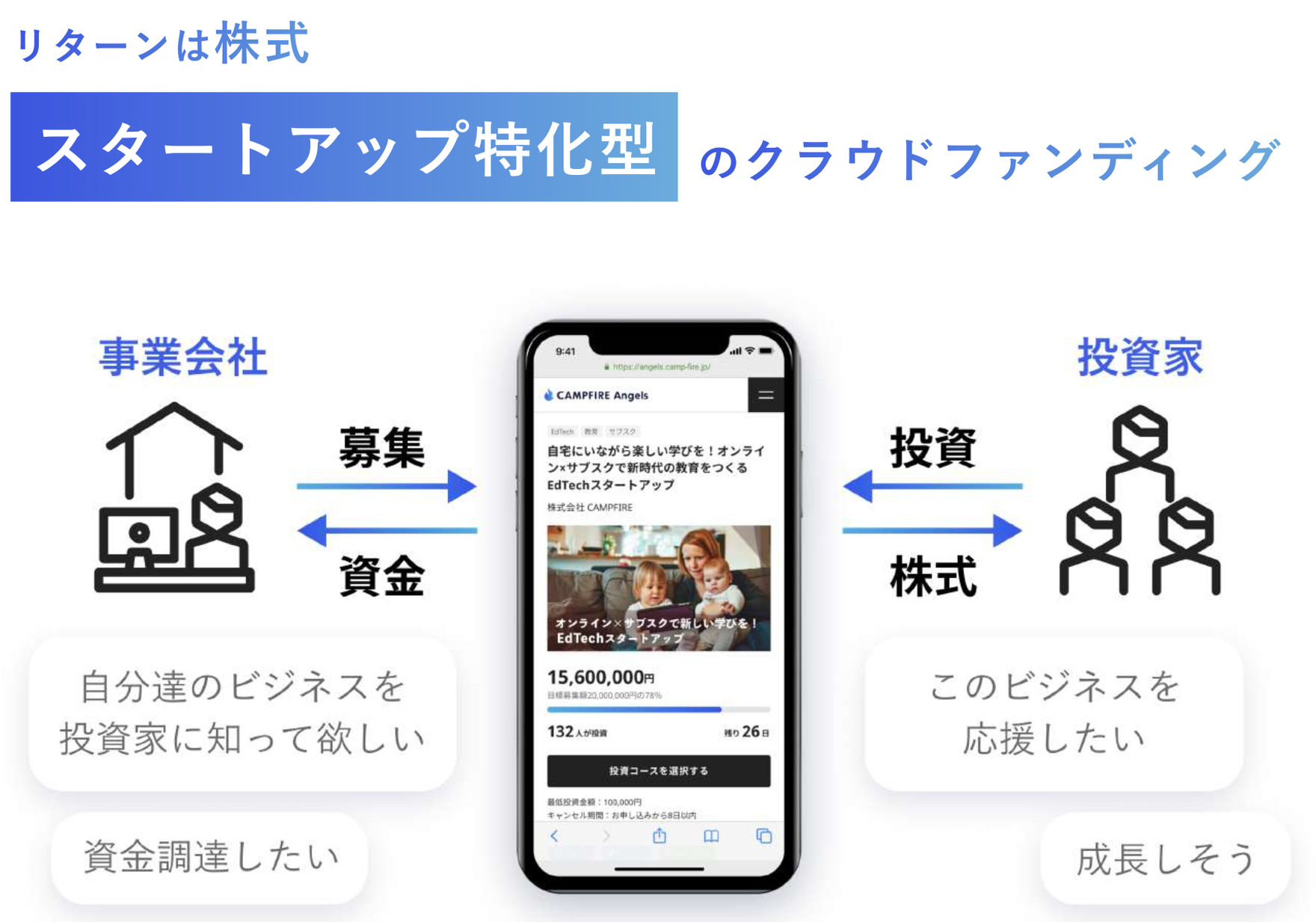 スタートアップを始めとする未上場会社とエンジェル投資家を繋ぐ、株式投資型クラウドファンディングサービスです。未上場会社には共感や応援の気持ちを起点にした「新しい資金調達の方法」を、エンジェル投資家には今まで関わることができなかった未上場会社へ「投資で応援する機会」を提供していきます。