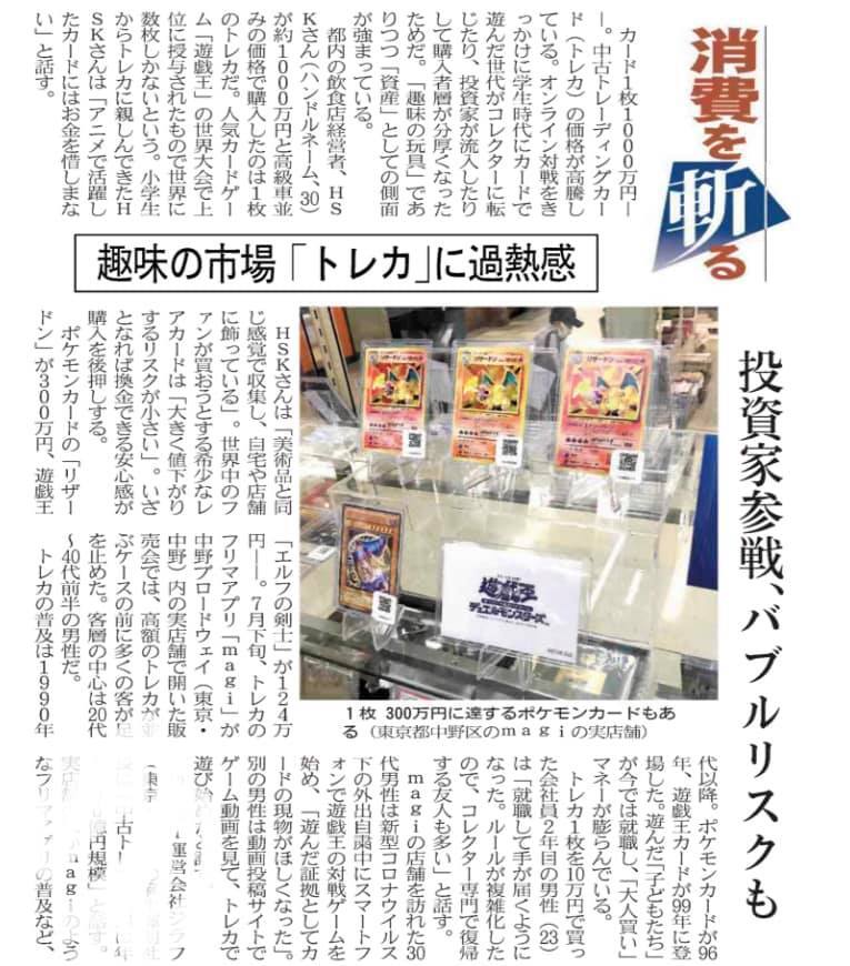 日経MJの1枚1000万円も、「トレカに潜むバブルのリスク 投資家参戦で価格高騰に拍車」という記事で当社運営店舗および代表の麻生のコメントが掲載されました。