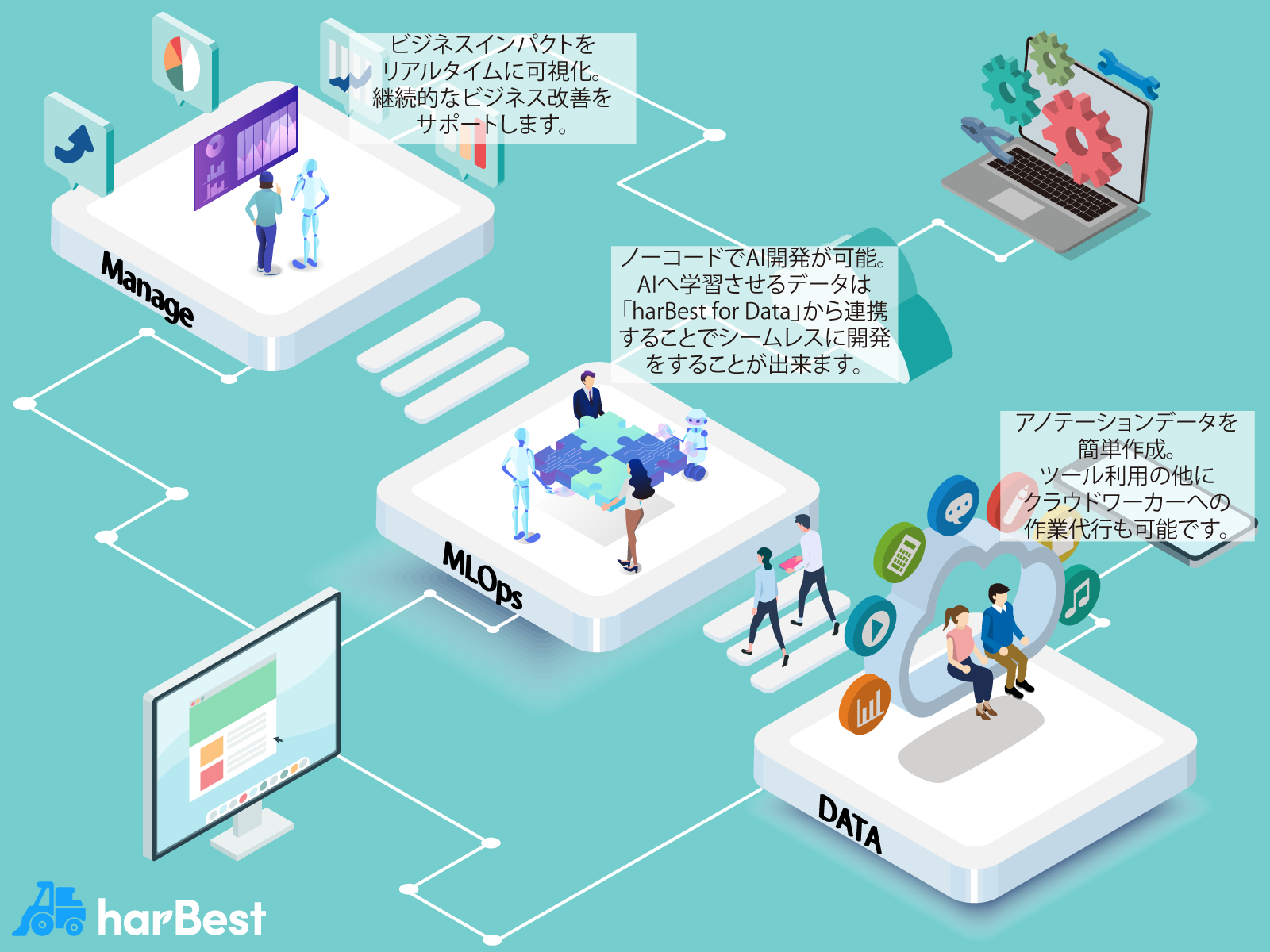 ・データ収集・作成、運用・評価まで実現することが可能なプラットフォーム「harBest」シリーズ(URL: https://harbest.io)