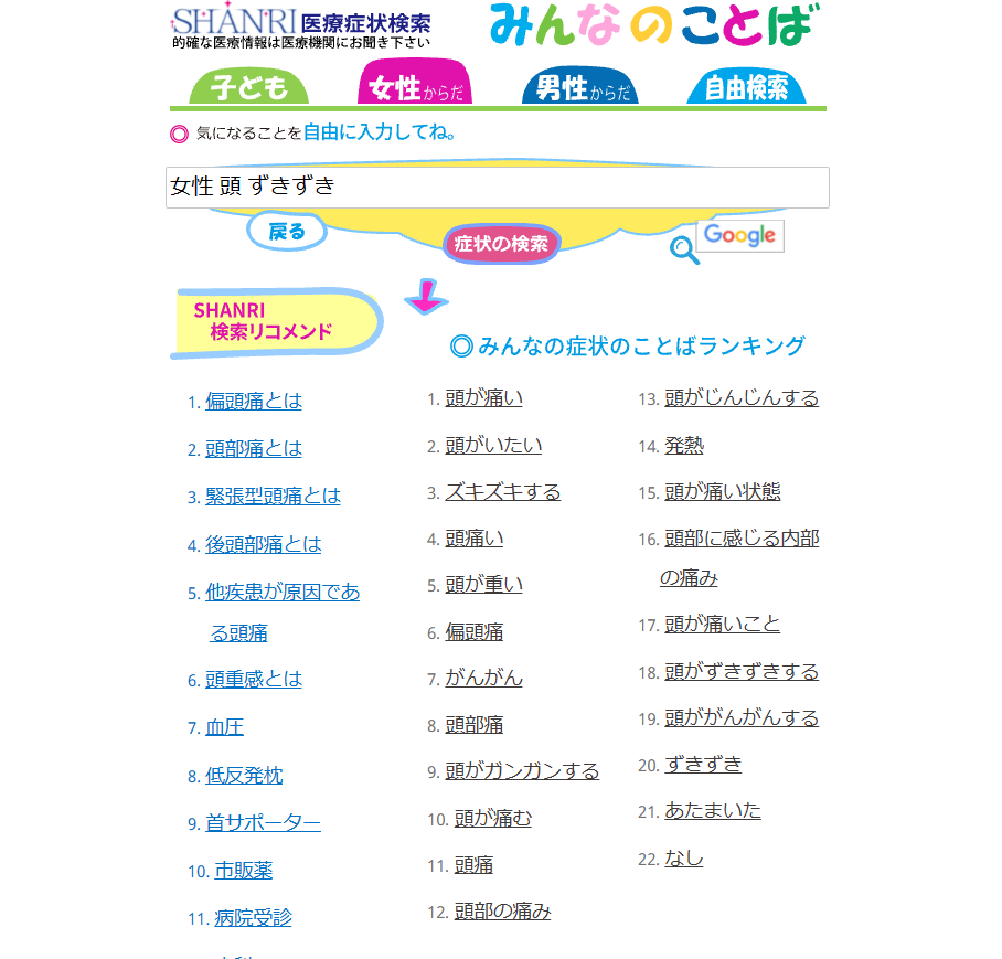 一般的には風邪の引きはじめの方が、「だるい」「背中が痛い」という単語を入力した場合、病に関連する詳細説明や医療機関サイトへの連携が主となります。