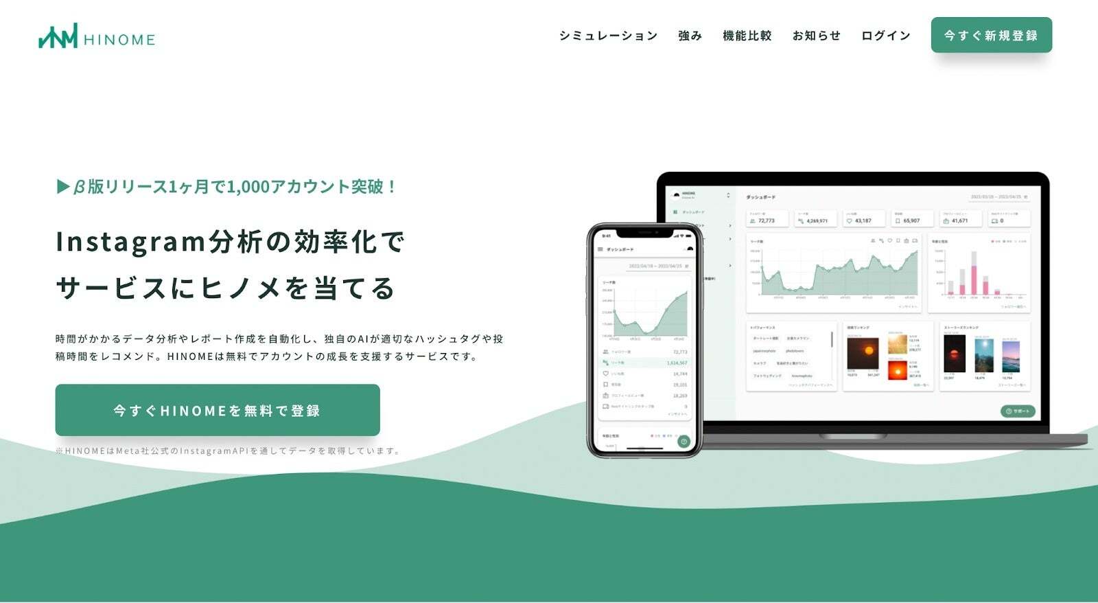 『HINOME』は、完全無料ですべての機能が利用可能なInstagram分析ツールです。基本的なデータの分析はもちろん、Instagram運用で重要だと言われている投稿してからの推移が分かる「初速分析」と、意外と考えることに時間と手間のかかる「ハッシュタグ」のおすすめ機能が搭載されています。さらに、β版リリース後より自社の目的に合わせて必要な情報をクリックひとつでレポーティング機能の拡充・カレンダー表示・ベンチマーク機能を搭載しました。もちろんセキュリティー面においても、最新の公式InstagramAPIにて開発しているため、安心してお使いいただけます。