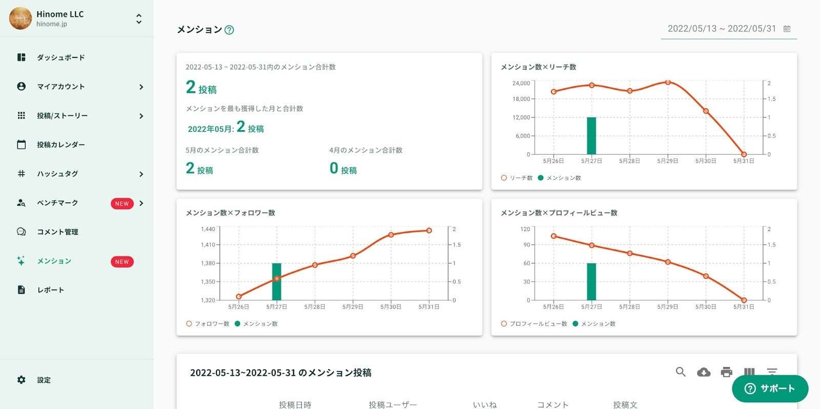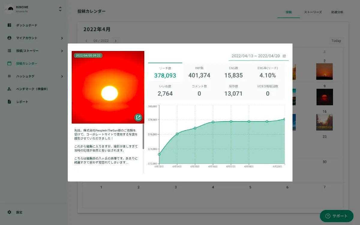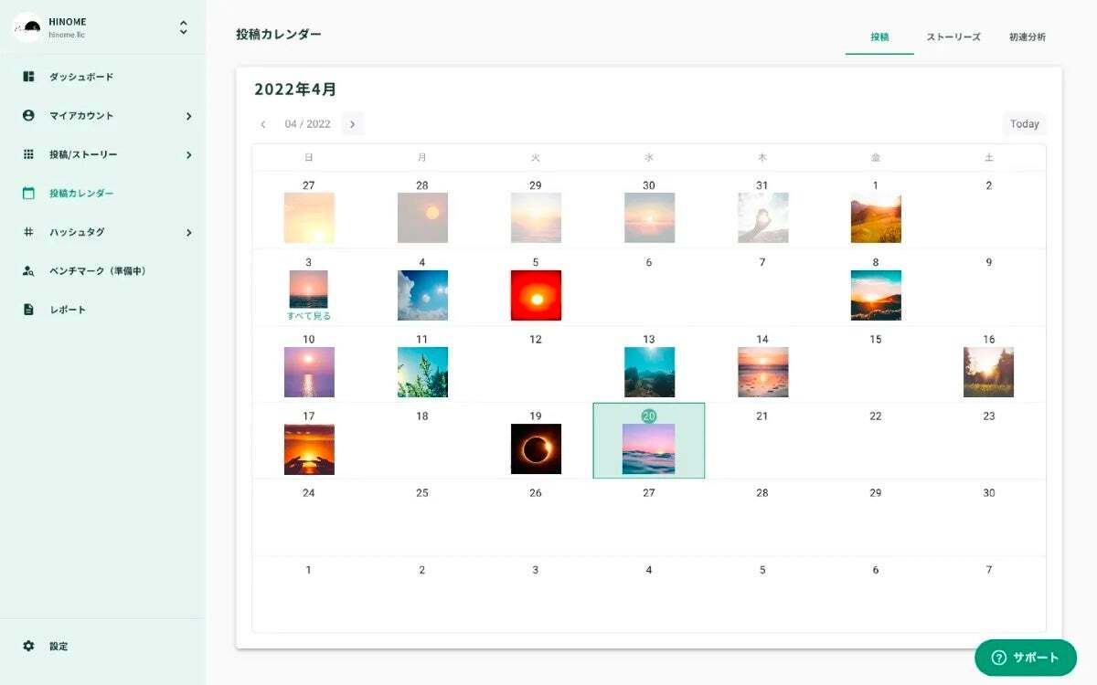 HINOMEでは、投稿データの確認はテーブル画面で実装していましたが、多くのHINOMEユーザーの皆様から「ストーリーズのアーカイブ機能のようにカレンダーで投稿のパフォーマンスをチェックしたい」というご要望をいただいておりました。また、投稿を確認するとき、「投稿のペースや色味を網羅的に把握したい」とのご要望も頂いており、これらのご要望にお応えすべく新たに「投稿カレンダー」機能をリリースしました。