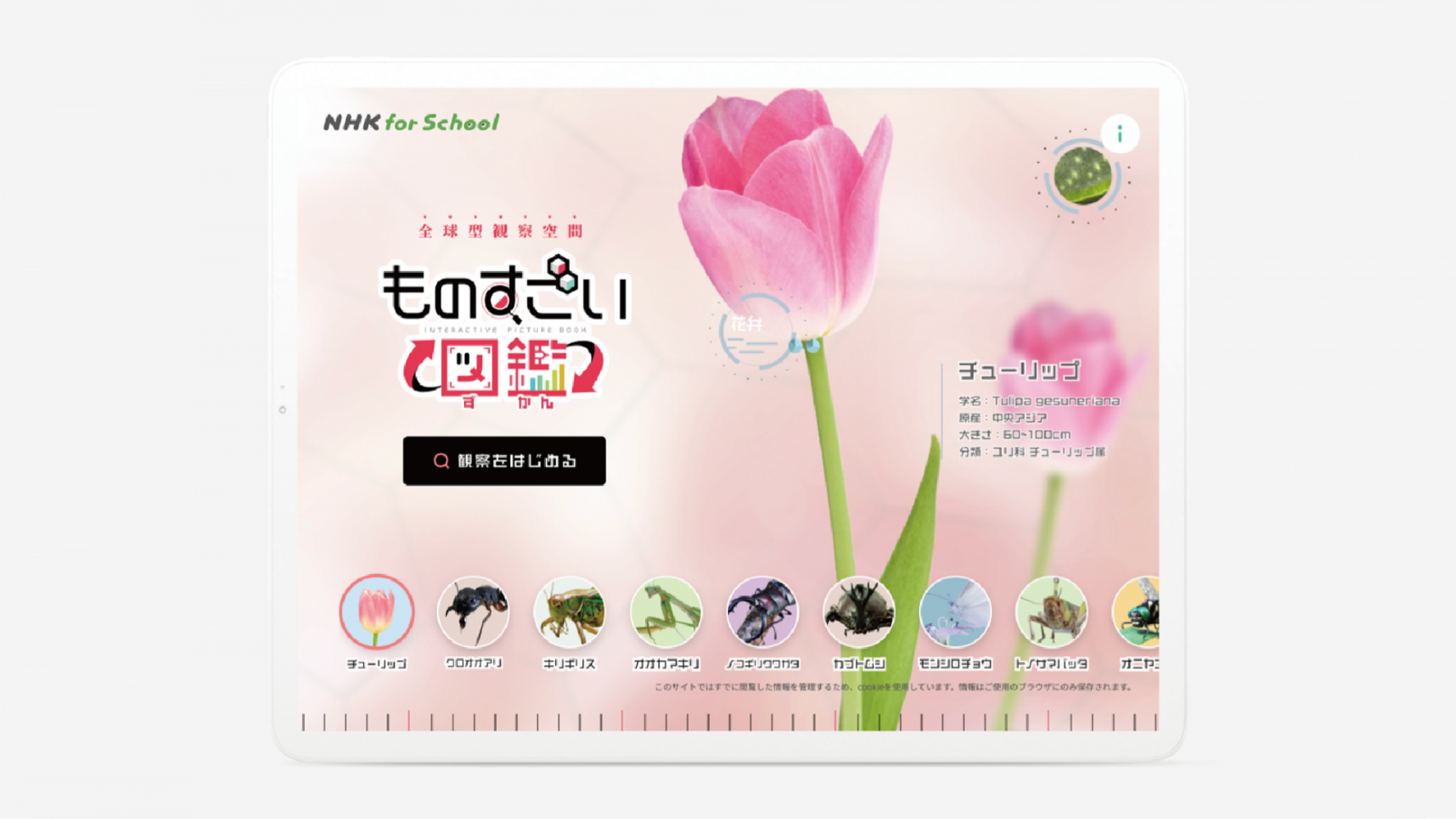 「ものすごい図鑑」は、昆虫をぐるぐる回したり、植物を自在に成長させたりして観察できるインタラクティブ図鑑で、昆虫の体のつくりや植物の生態などについての知識が、楽しく体感的に得られる教育コンテンツです。