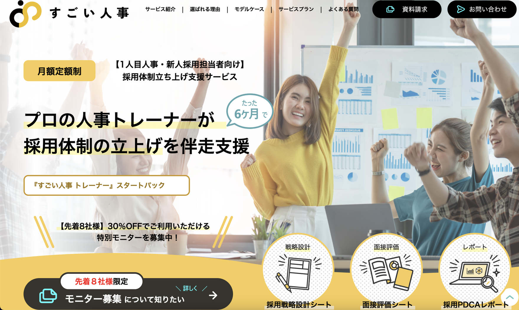 弊社はこれまで、すごい人事事業を通じ、100社以上の採用支援に取り組ませていただきました。そして、そこで培ってきたノウハウや知見をぎゅっと詰みんだ人事トレーニングプログラム「すごい人事トレーナー」をつくりました。