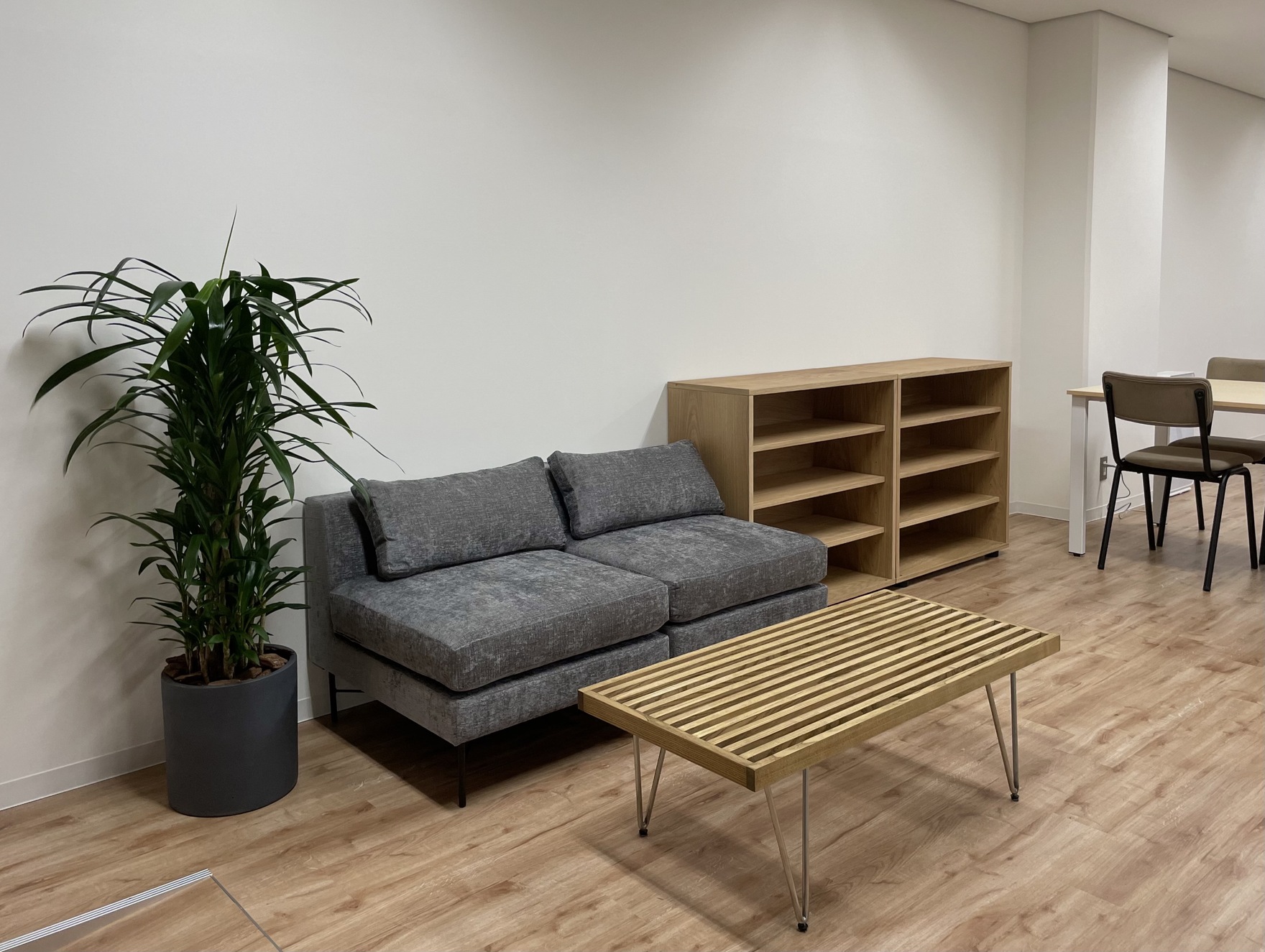 ワークスペースのチェアにはコーデュロイを取り入れ、柔らかい印象に。入口すぐ左手のソファとローテーブルのエリアはリラックスできる空間にしました。