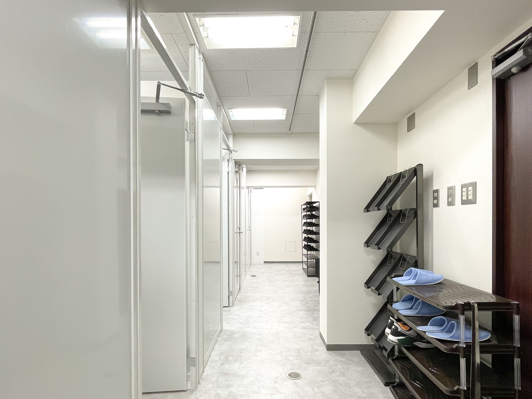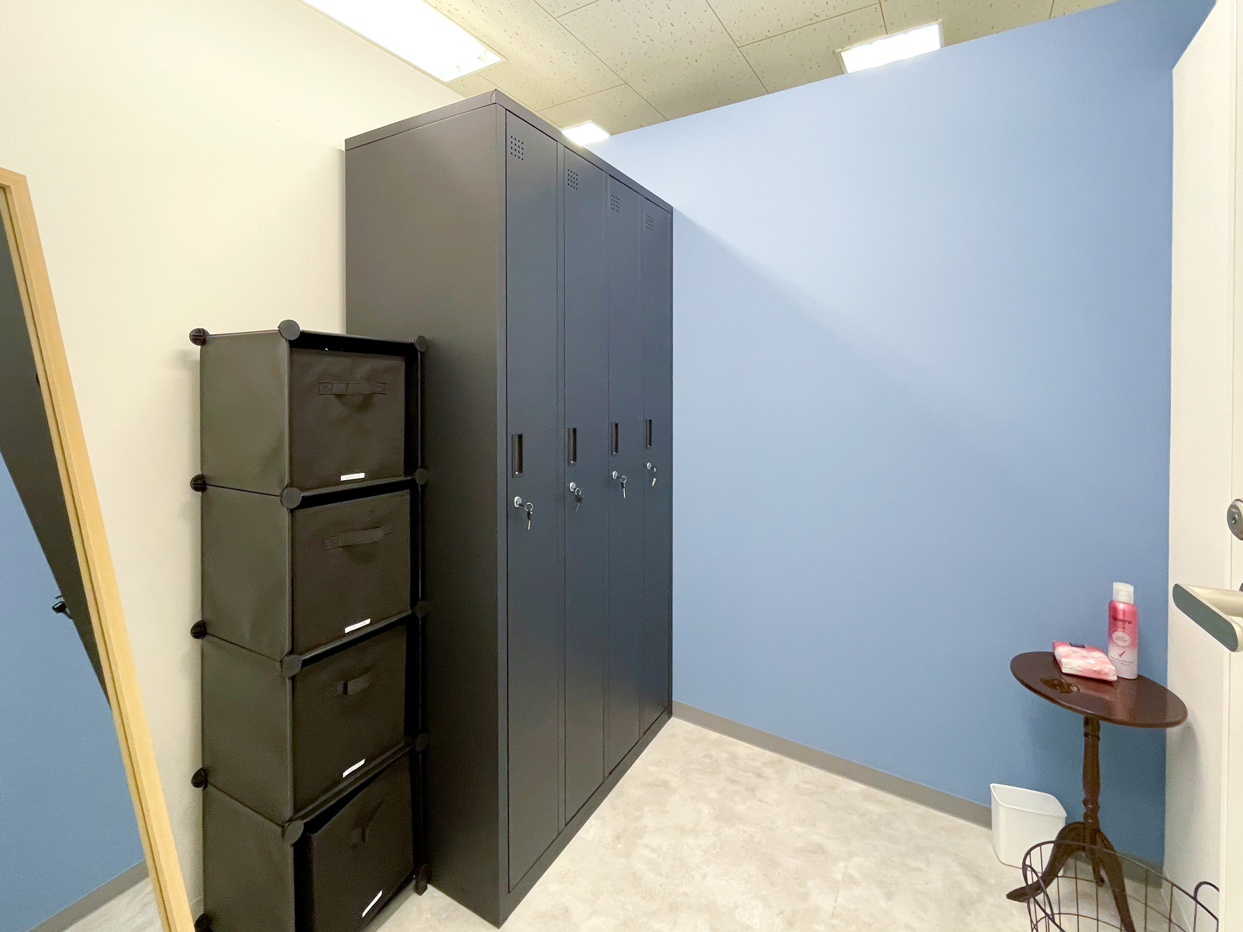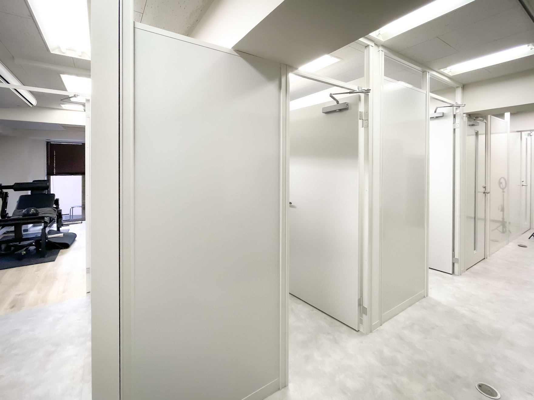 内装は落ち着いたトーンの色味で統一し、更衣室にはアクセントにパステルカラーを使うことで柔らかな雰囲気のあるジムに仕上がりました。