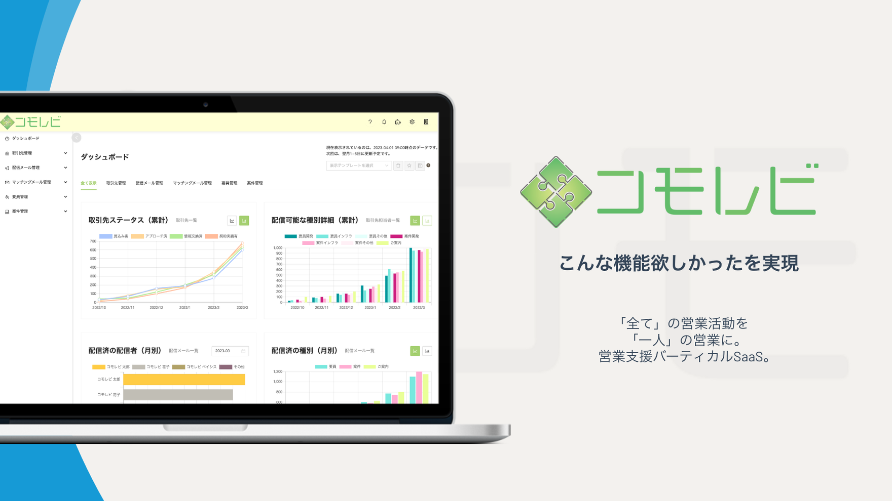 このような背景のもと、「営業支援ツールを最小限のコストで導入できるシステム」としてコモレビが誕生しました。