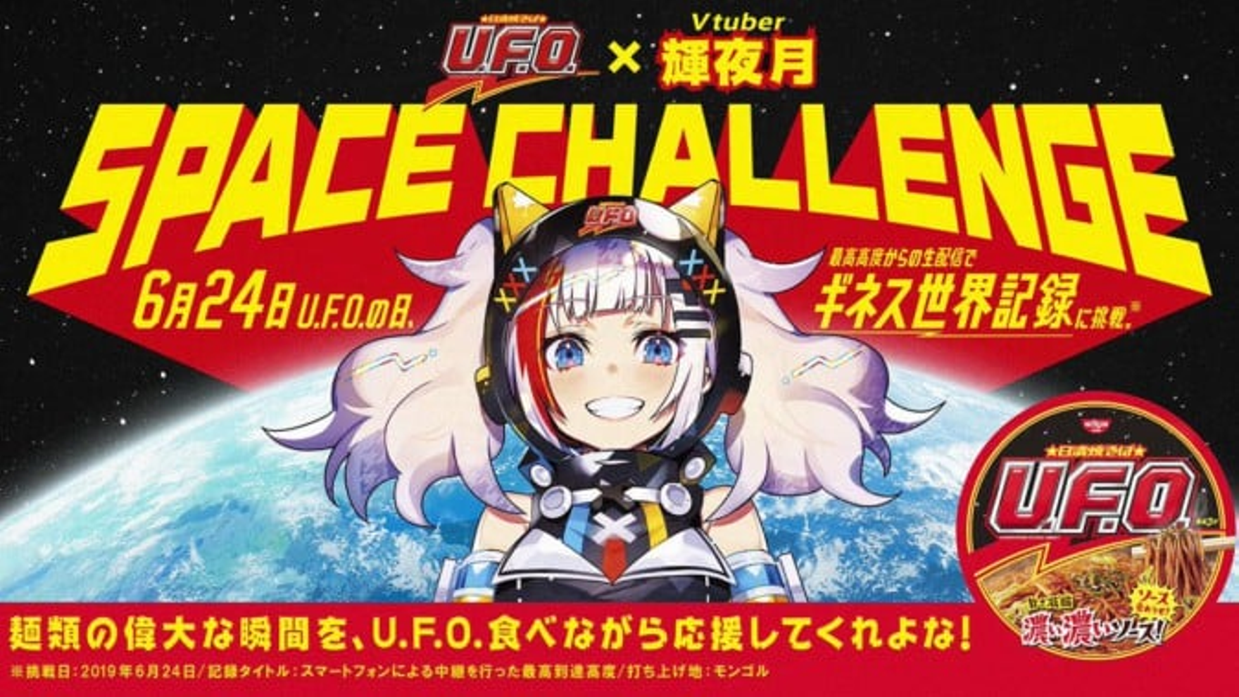 2019年6月24日、「日清焼そばU.F.O.」を宇宙に向けて打ち上げる企画にバーチャルYouTuberの輝夜月が起用されました。輝夜月を映したディスプレイを載せた日清焼そばU.F.O.を気球にぶら下げて飛ばし、宇宙に向けて打ち上げ、歴代最高高度からのスマートフォンによる生配信でギネス世界記録を達成しました。