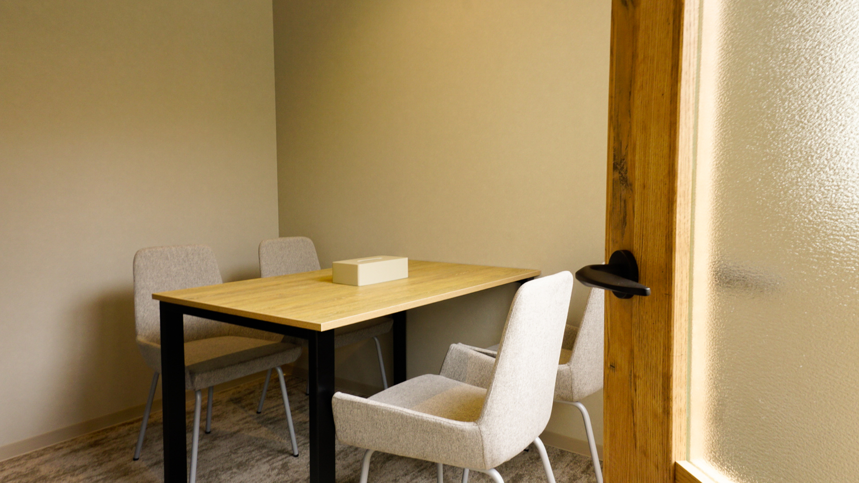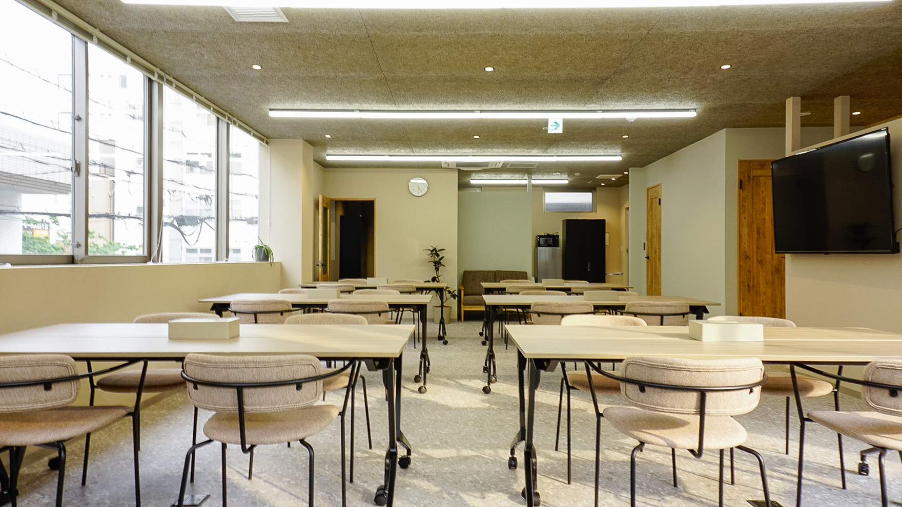 ベージュを基調とし、天井を木毛セメント板で仕上げることでナチュラルで柔らかい雰囲気を演出し、黒の家具などが空間を引き締めることで全体的にバランスの取れた空間となりました。