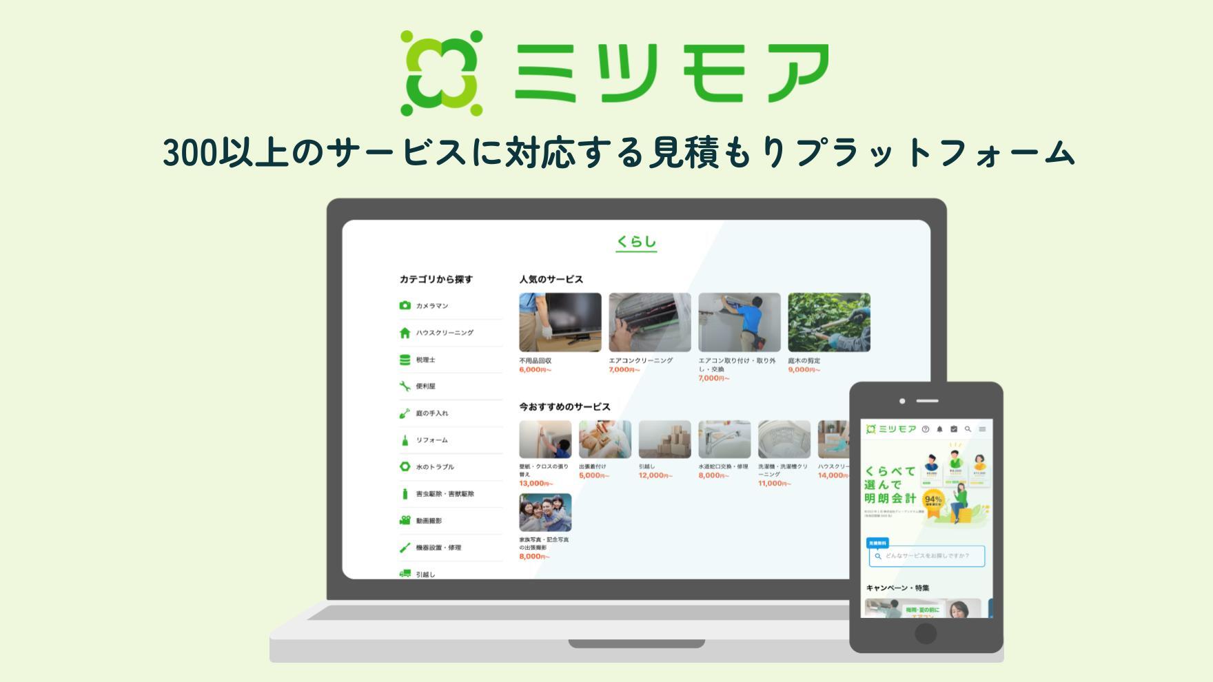 ミツモアは「エアコンクリーニング」「引っ越し」といった暮らしから「税理士」「ソフトウェア比較」といったビジネスまで、300以上のサービスに対応する見積もりプラットフォームです。