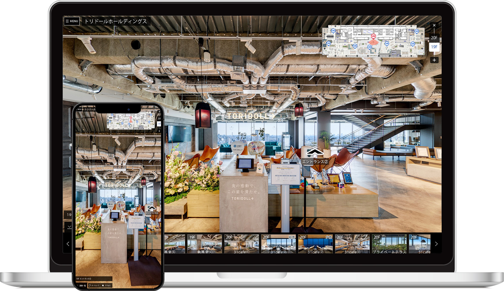 「丸亀製麺」など外食事業を展開するトリドールホールディングスのオフィスVRを制作した際には「眺望の昼夜切り替え」など、ユーザーにオフィスで働いているイメージを持っていただく工夫を盛り込みました。