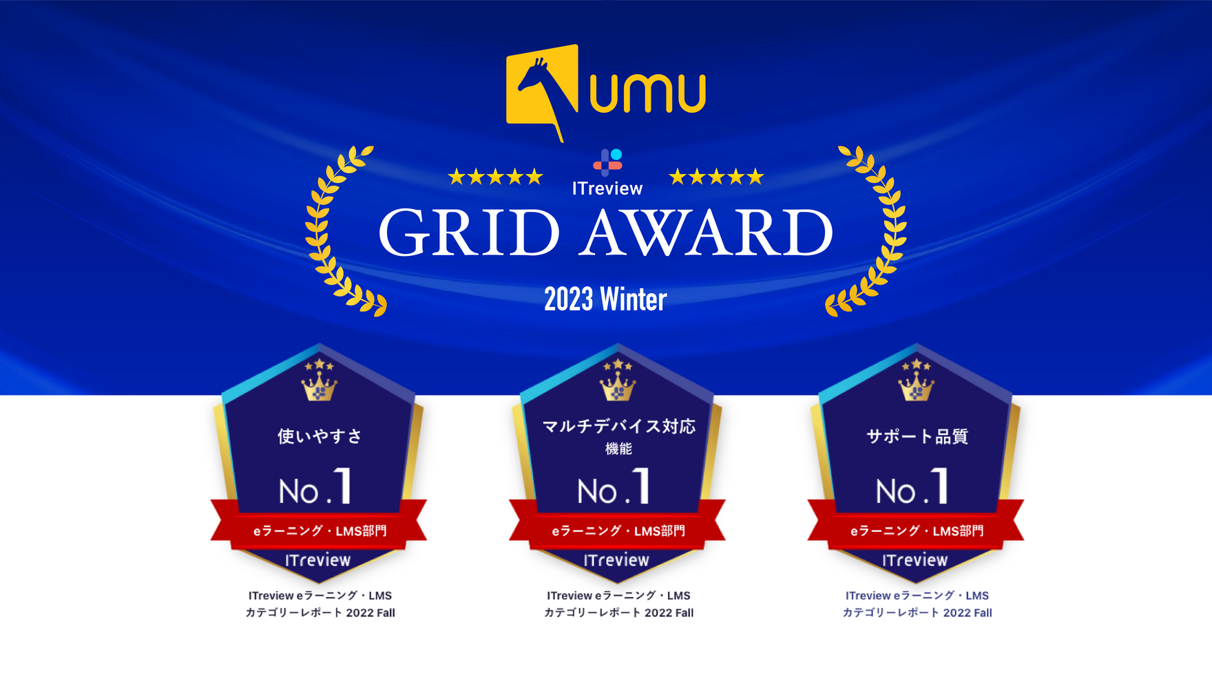 ユームテクノロジージャパン株式会社が提供するオンライン学習プラットフォーム「UMU(ユーム)」は、アイティクラウド株式会社(本社:東京都港区、代表取締役社長 兼 CEO:黒野 源太)が主催のアワード「ITreview Grid Award 2022 WINTER」にて、「eラーニング・LMS部門」「セールスイネーブルメント部門」「マニュアル作成・編集部門」それぞれにおいて満足度・認知度ともに優れた製品であると評価され、「Leader」を同時受賞いたしましたので、お知らせいたします!