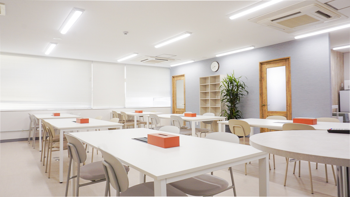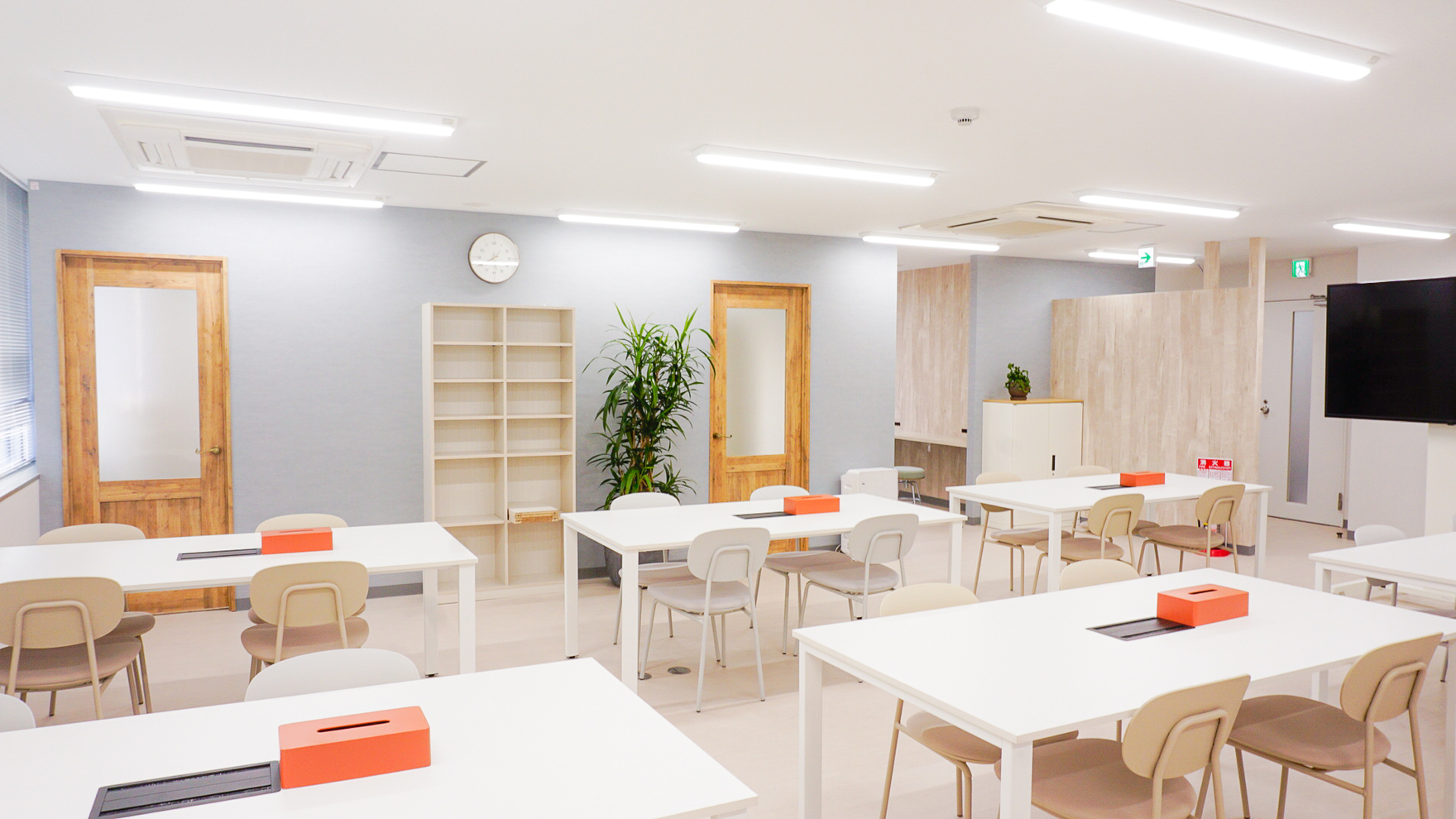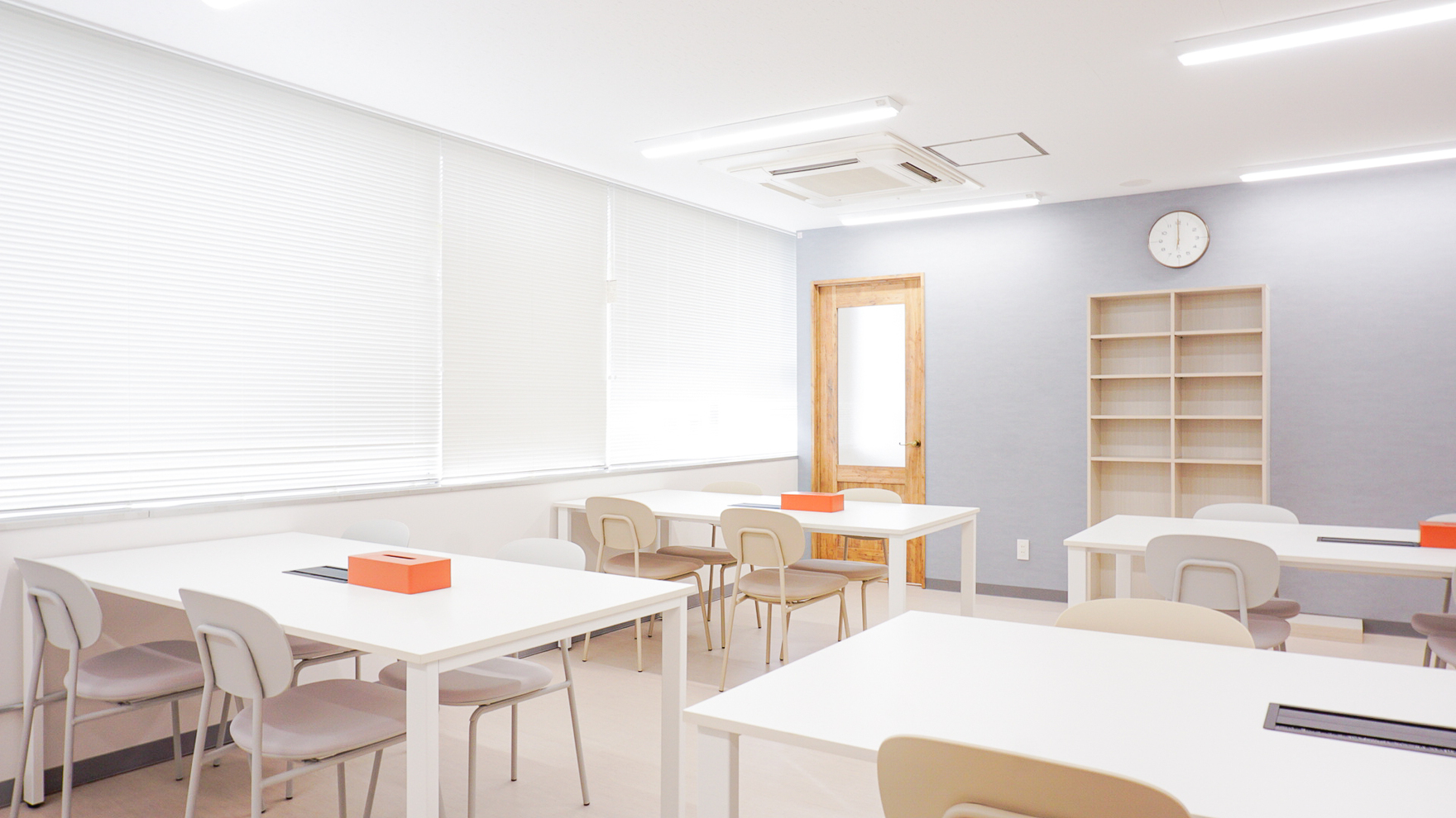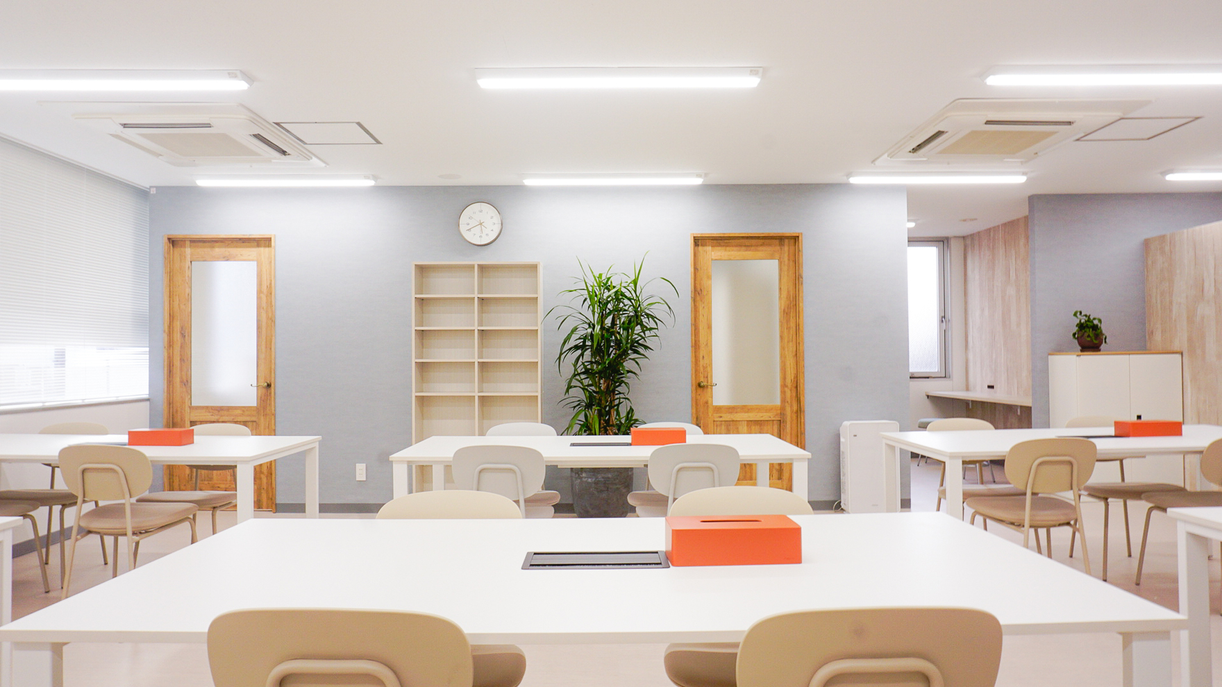ブルーの間仕切り壁で藤沢市(湘南・江ノ島)の海をイメージし、家具は白を基調とした明るく爽やかな内装デザインとしました。オレンジ色のペーパーボックスが空間を際立たせるアクセントとなっています。