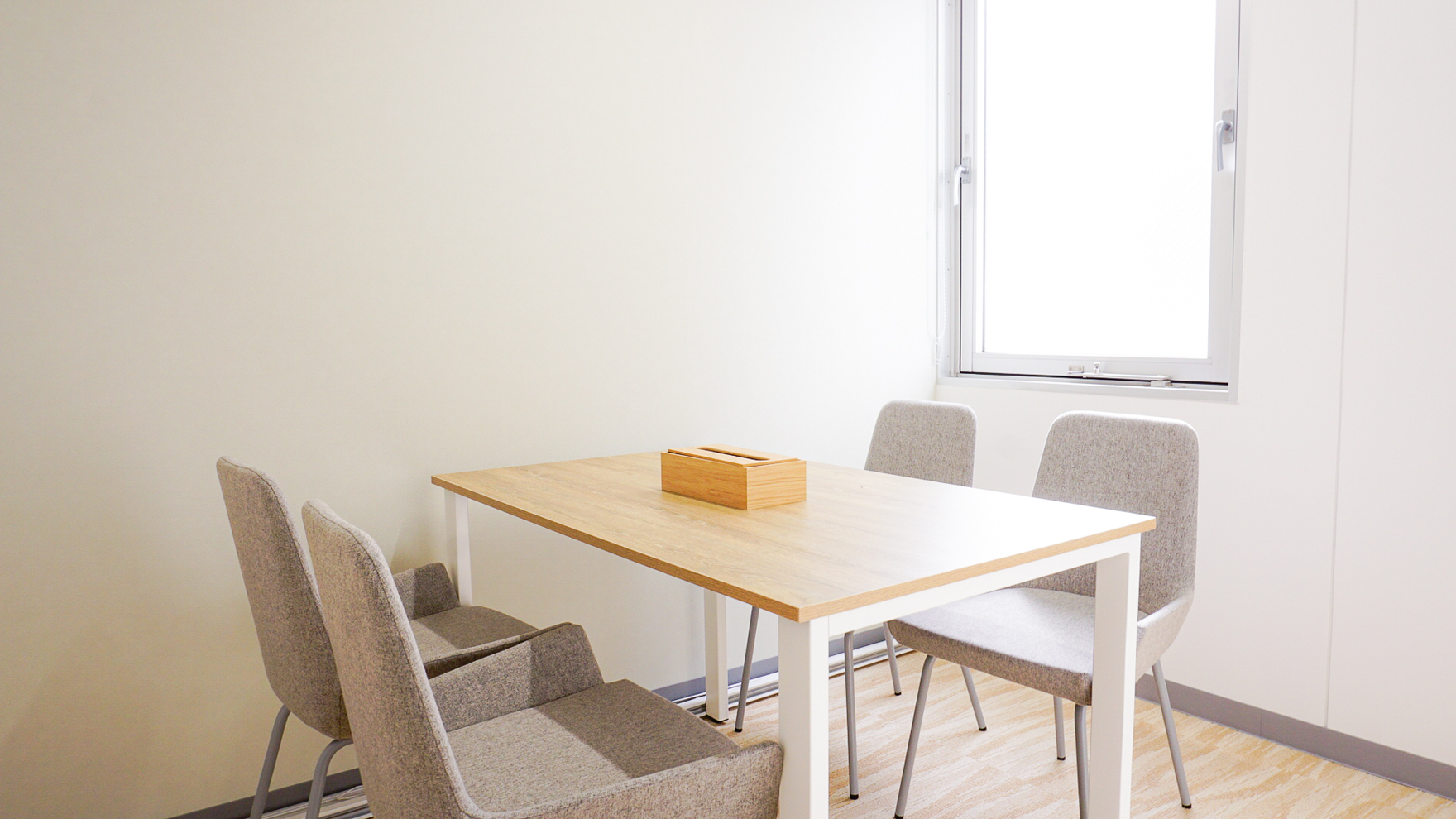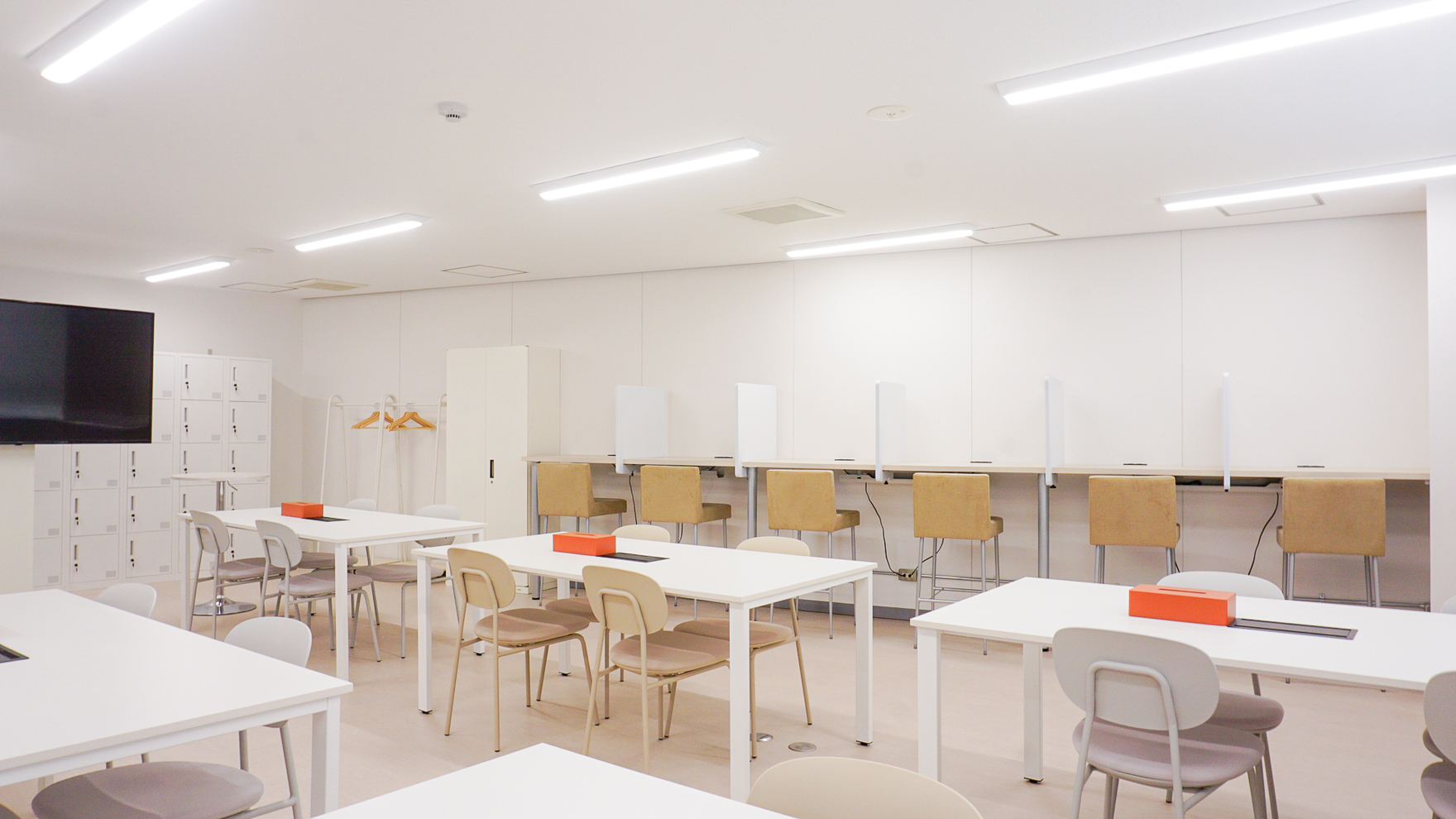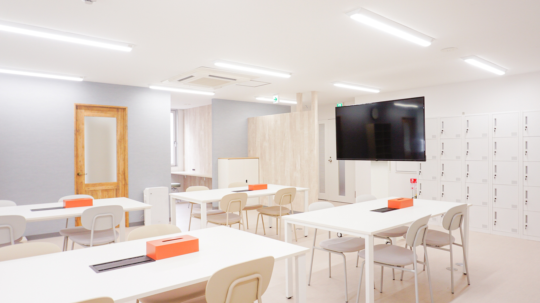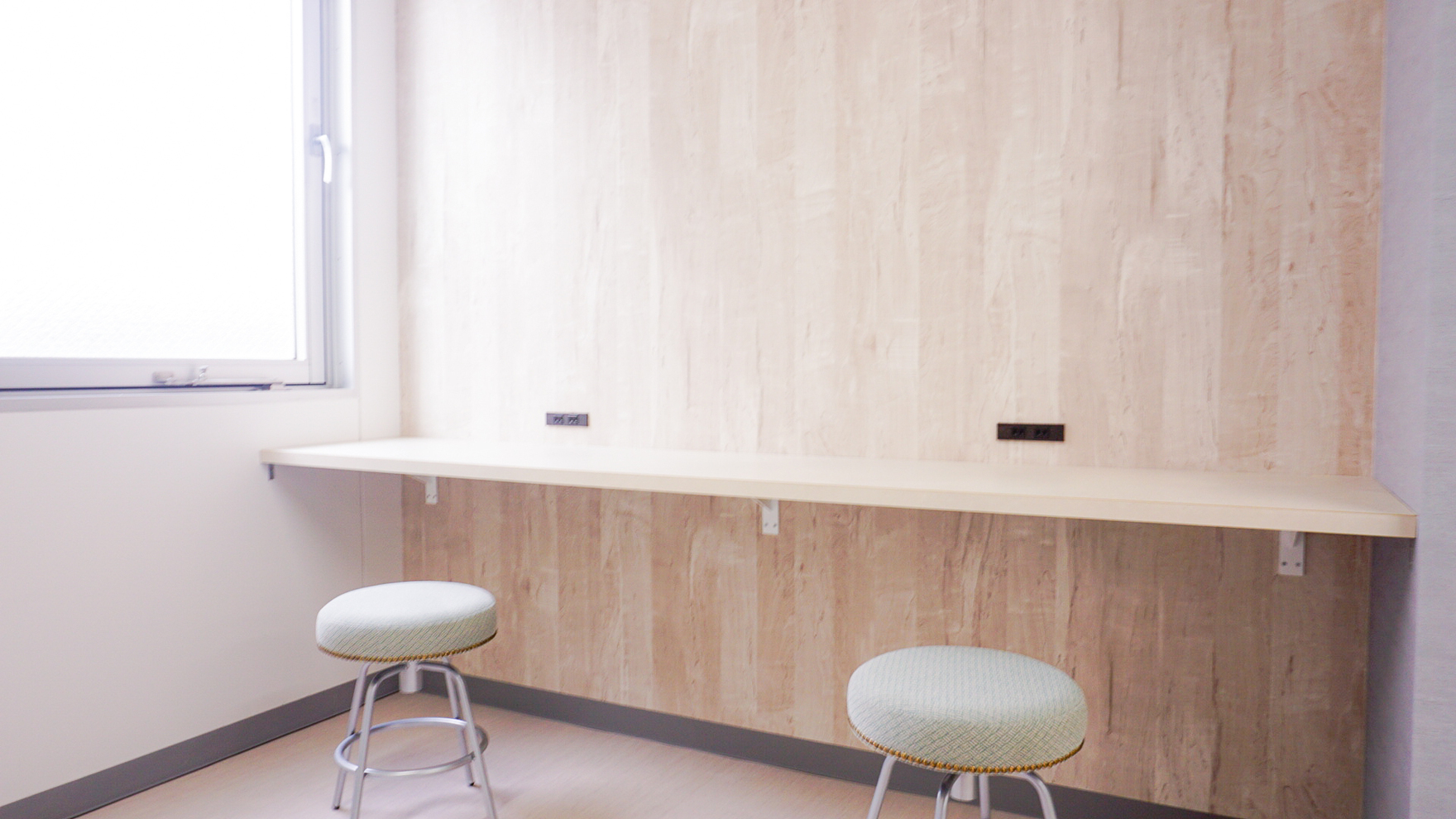 壁に沿うようにカウンターを設けることで、室内の特徴を活かした広がりを感じられるレイアウトとしました。バックスペースにも造作カウンターを設け、軽作業等ができるスペースとしたことで、利用者だけでなくスタッフにも配慮したセンターとなっています。