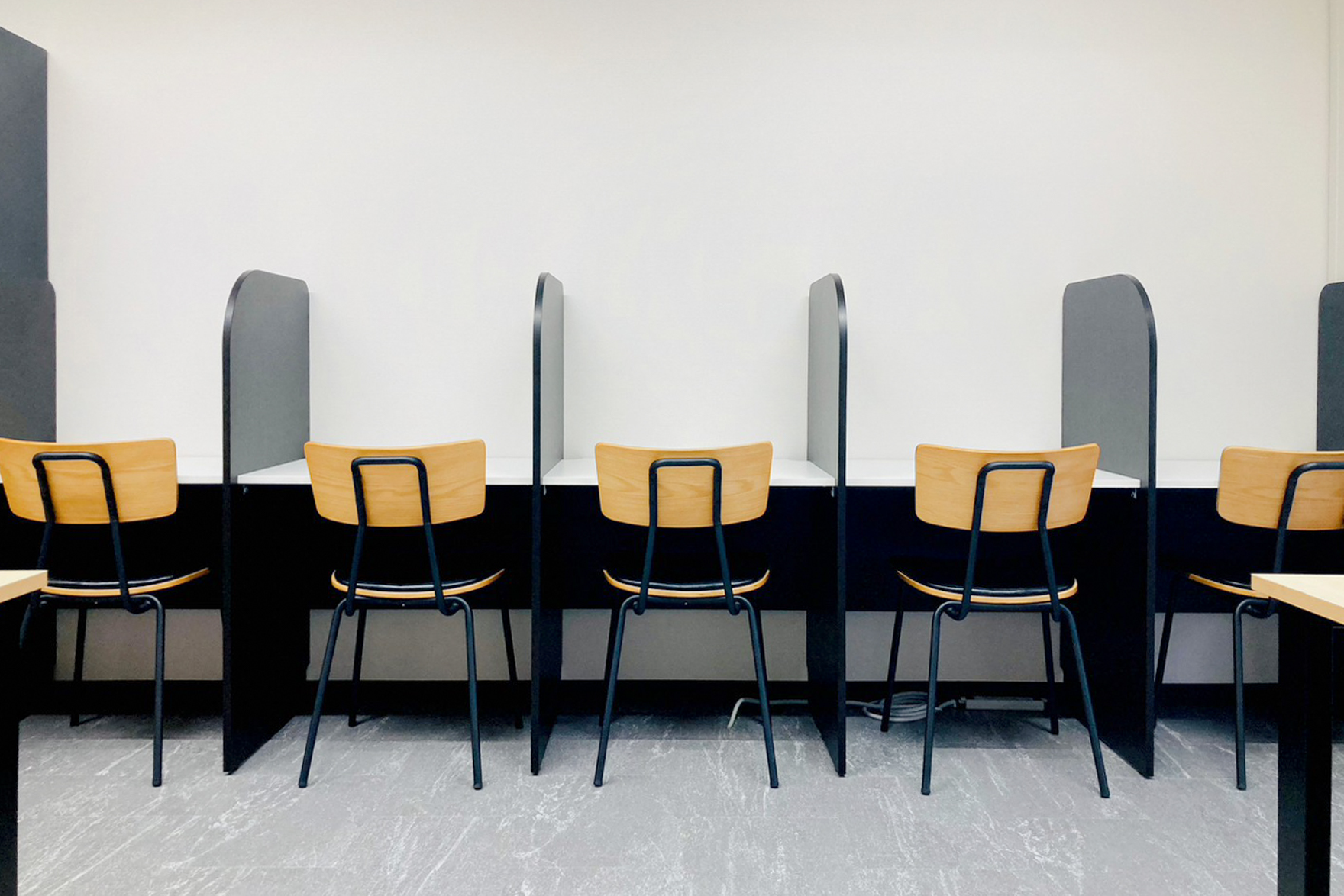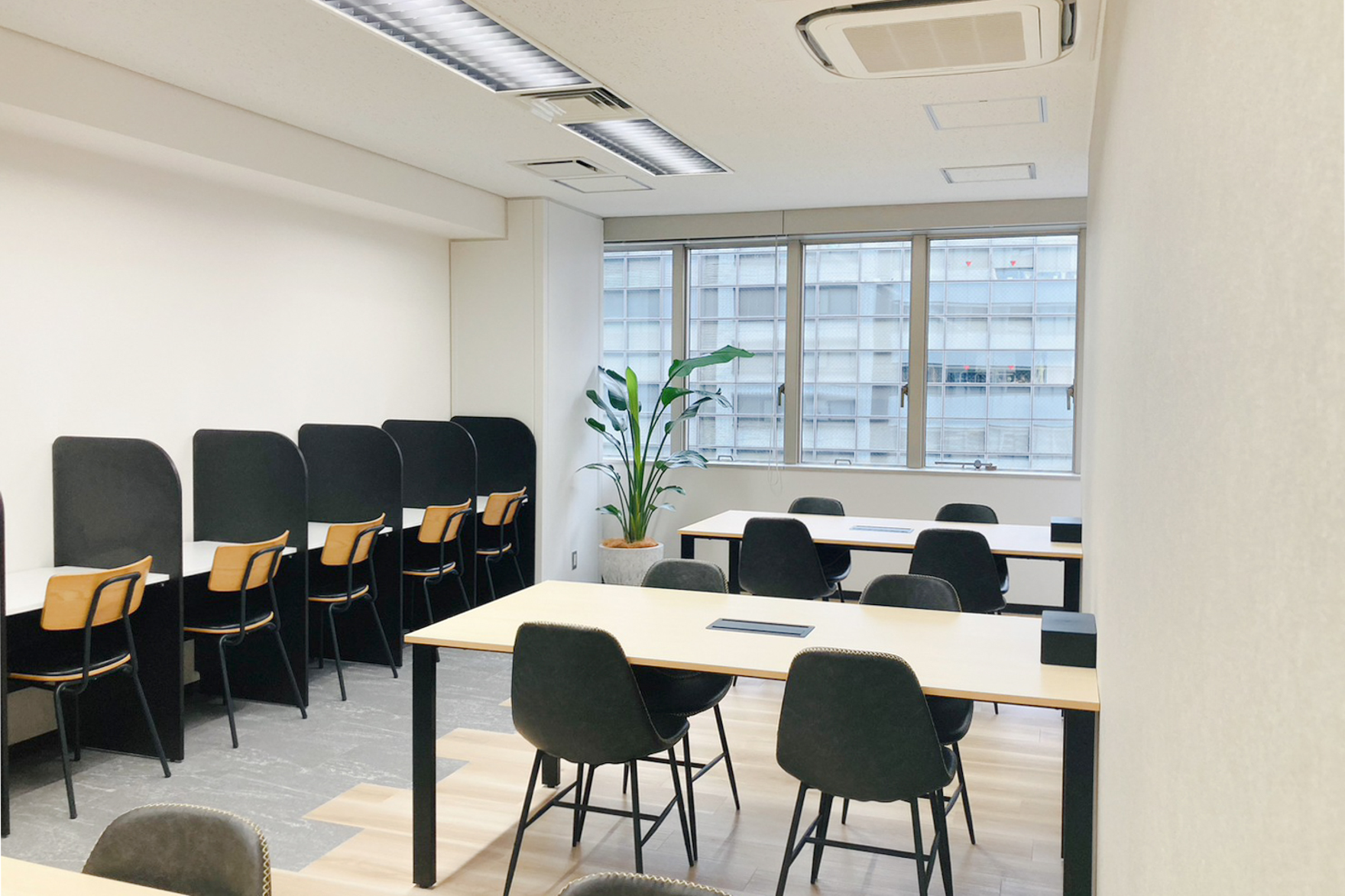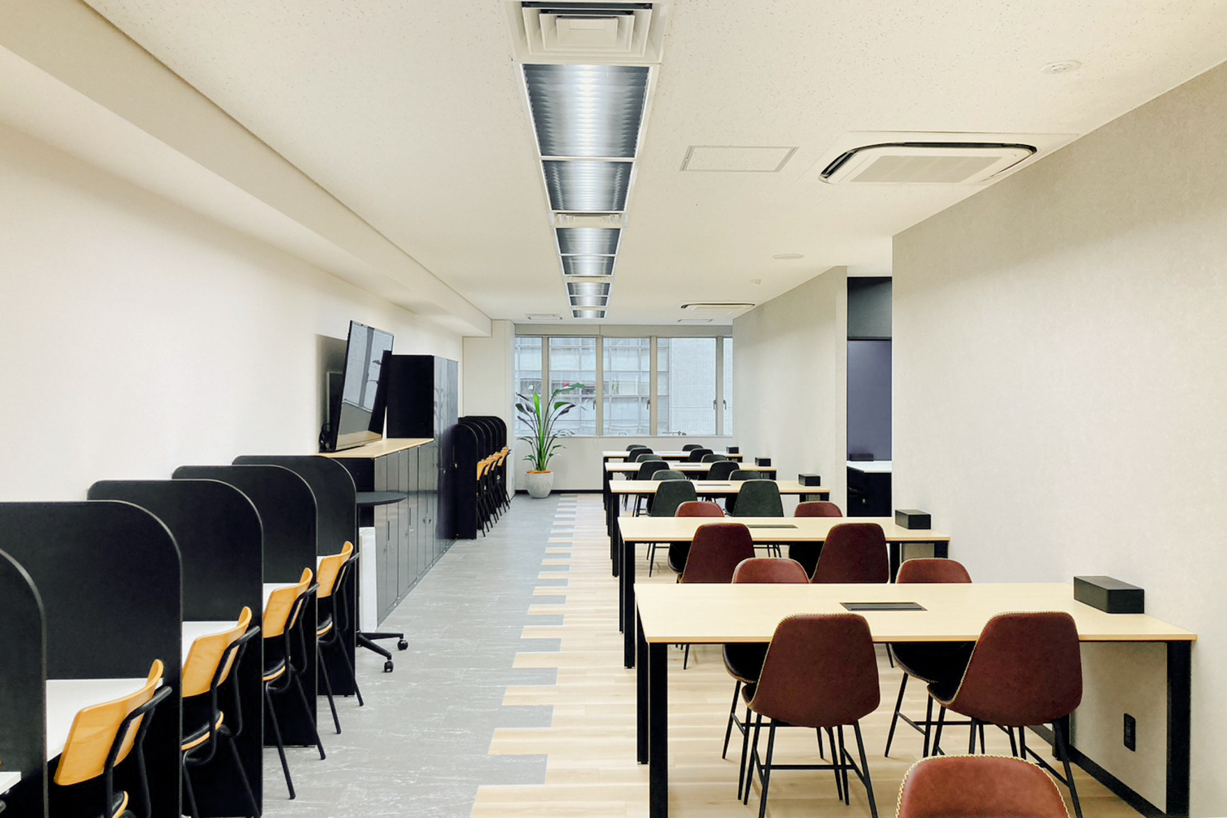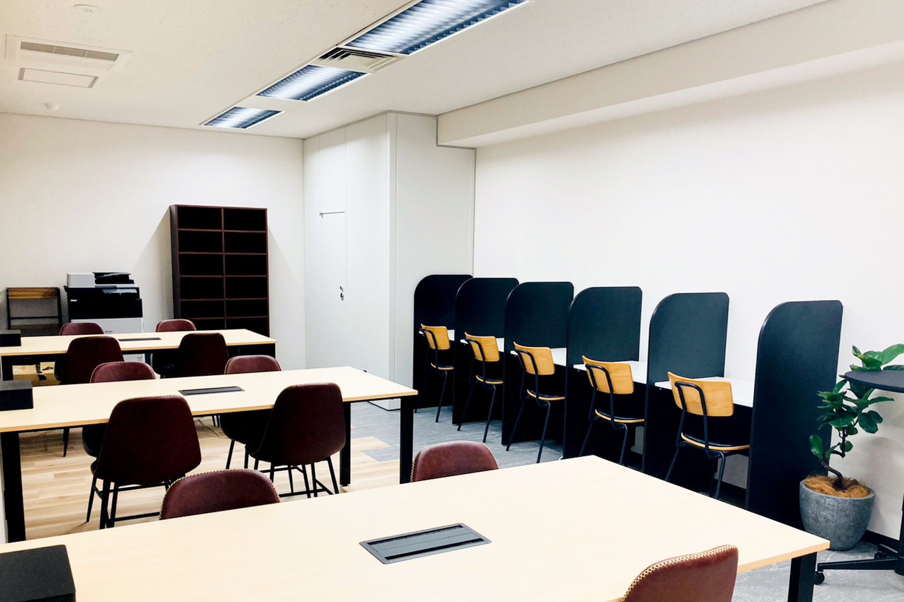 レイアウトでは、長方形の間取りを生かし、長手方向いっぱいに訓練室を配置して開放的に見せる視覚効果を狙いました。また、設計要件上どうしても独立したエントランス空間を作らなければならないという点を利用し、そこだけ照明の色と明るさを変え雰囲気のある空間を演出するなどの工夫を盛り込みました。