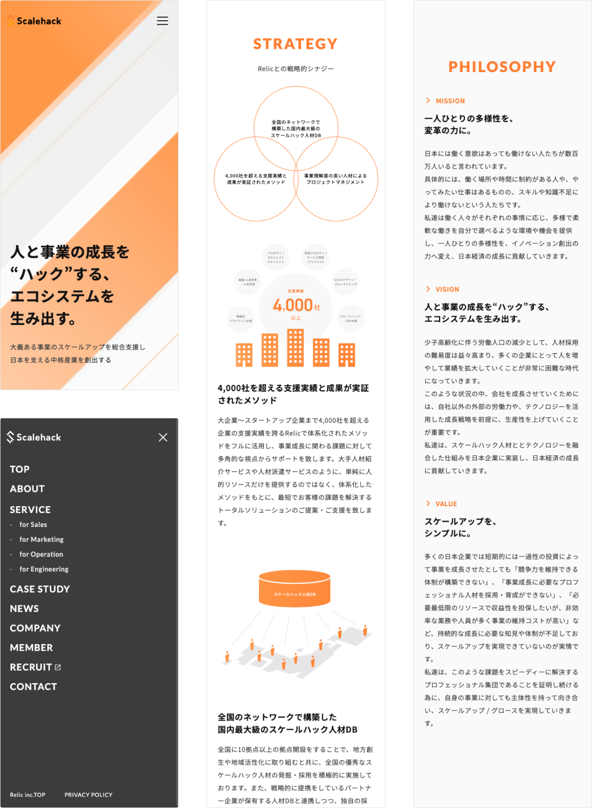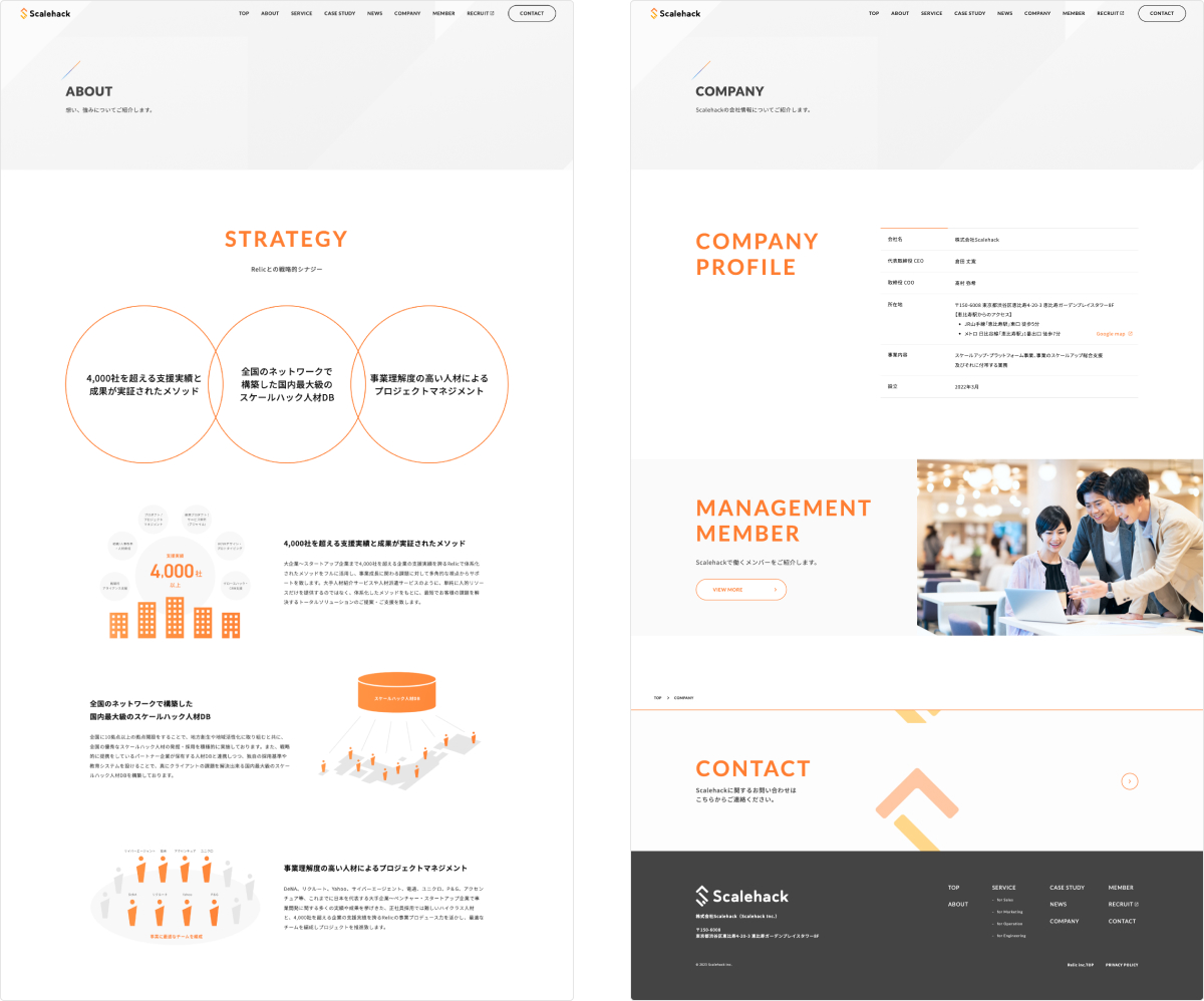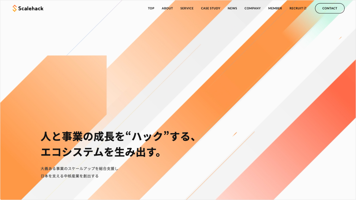 スケールアップ・プラットフォーム事業や事業のスケールアップ総合支援を提供する”株式会社Scalehack”のコーポレートサイトのデザインを担当しました。事業の成長を象徴するモーショングラフィックをキービジュアルとして採用することで事業が成長してゆく期待感を表現しました。
