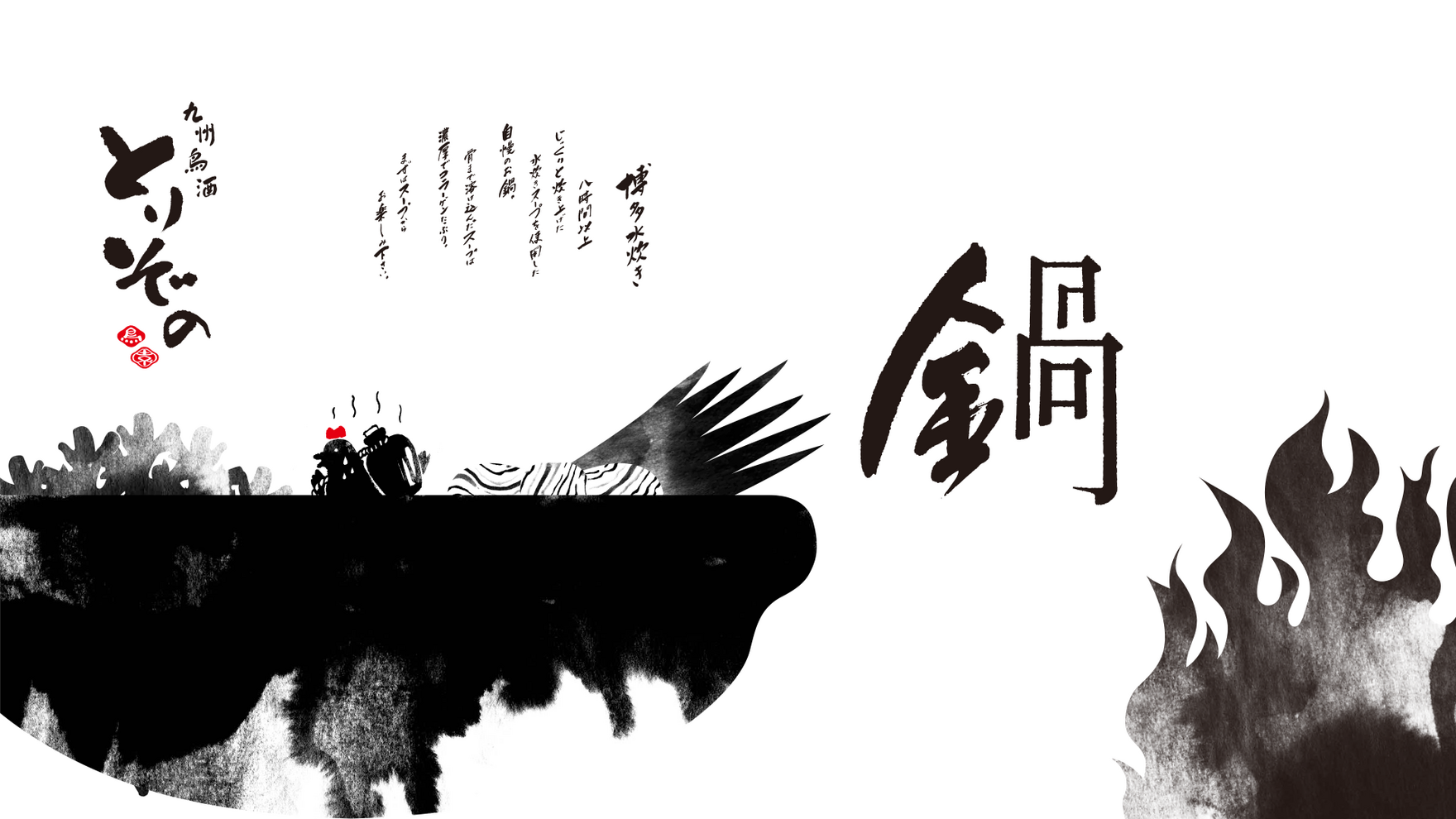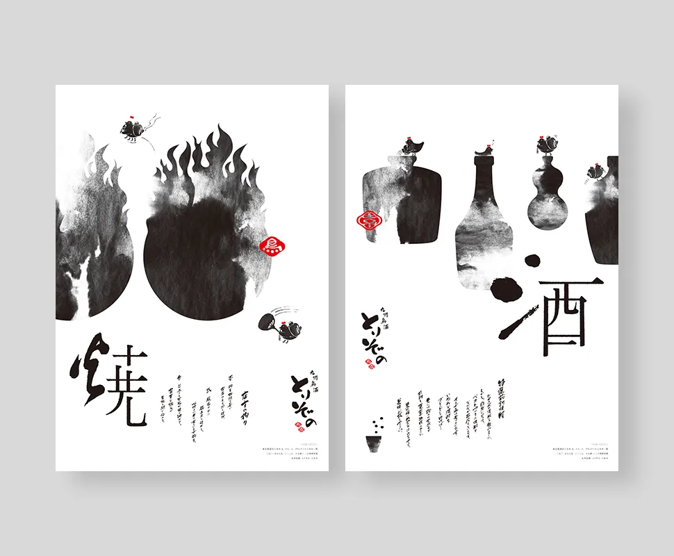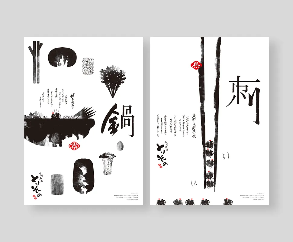 九州の地鶏料理店である「とりぞの」のロゴデザインおよびアートワークを担当しました。ロゴに採用した鳥のキャラクターをもとに、ポスターや店内装飾、メニューブックなどさまざまなグラフィックを展開しています。