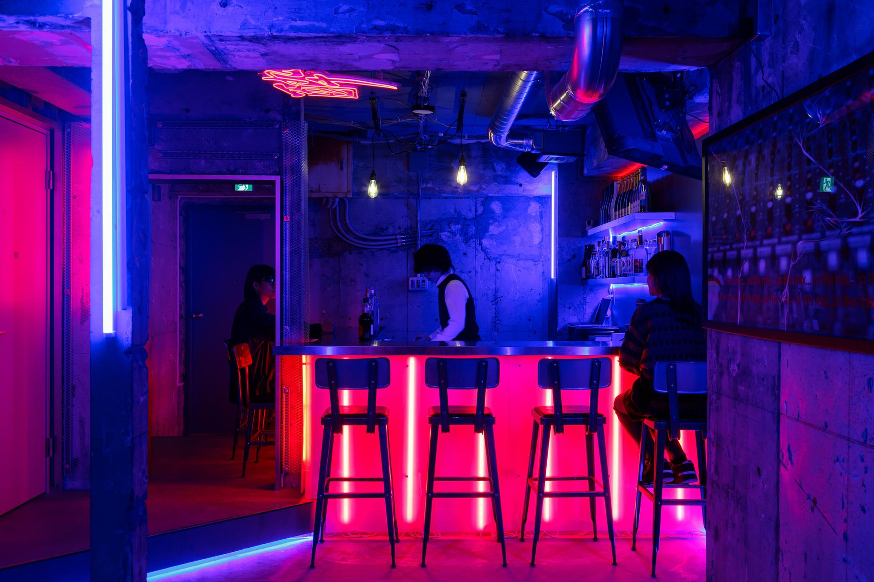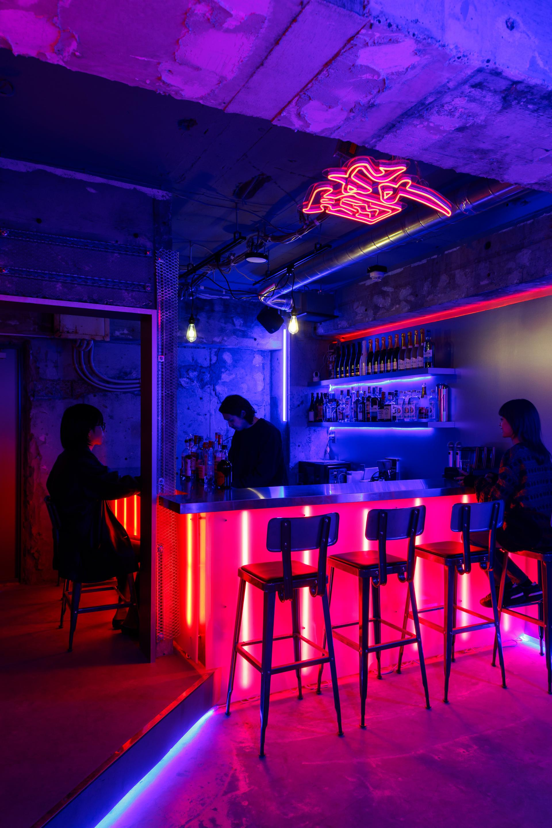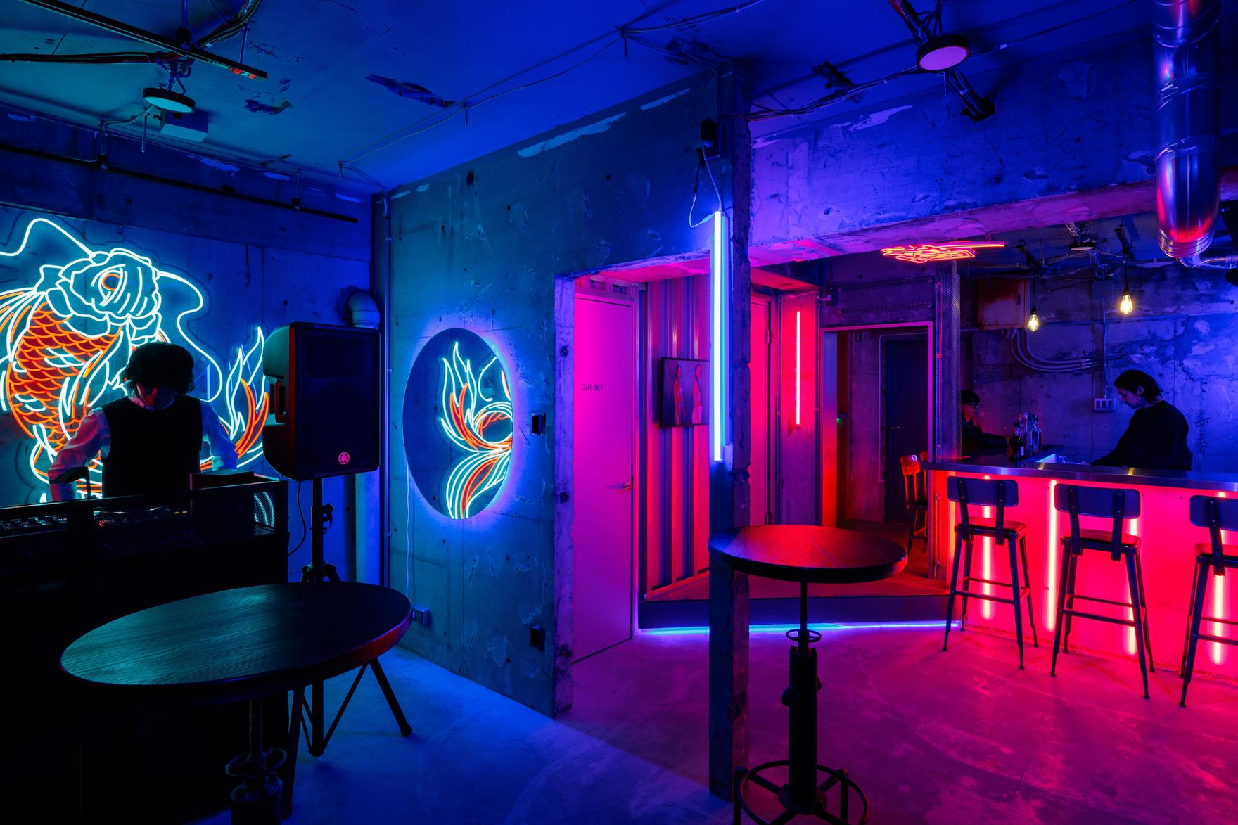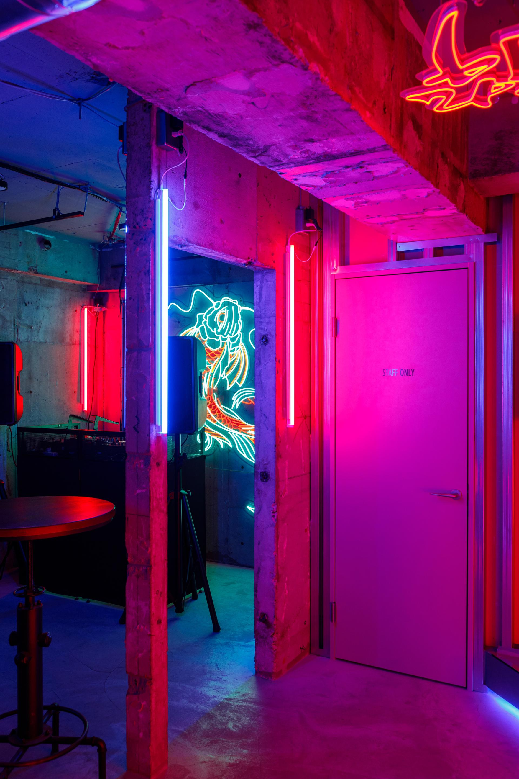 テーマは「ネオ居酒屋」。レトロと現代が融合し、若者から大人まで幅広い層に注目される「ネオ」テイストに「秘密基地」や「レイブ」テイストを加え、都心の遊び心あふれる人々に向けた非現実的で特別な空間を目指しました。