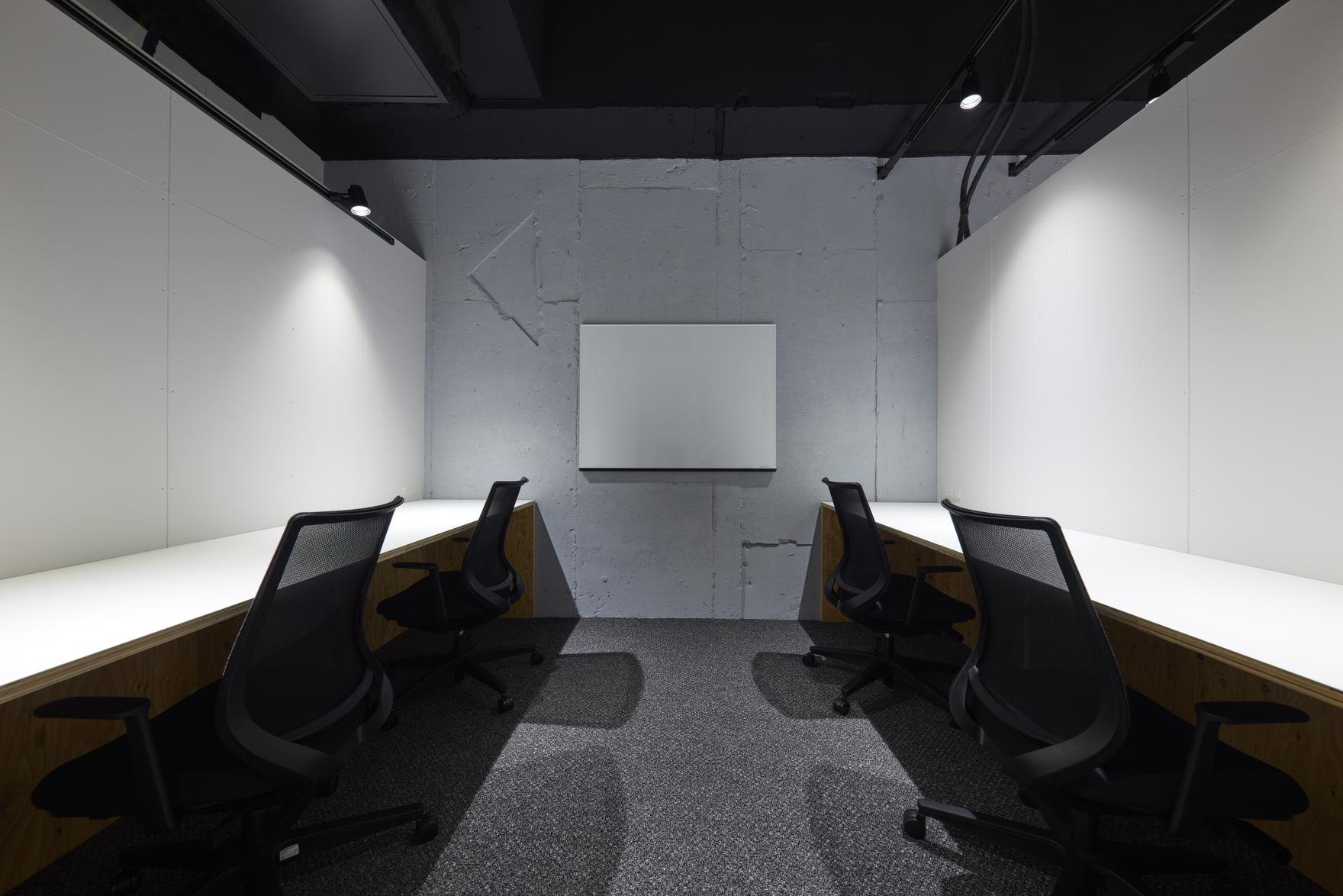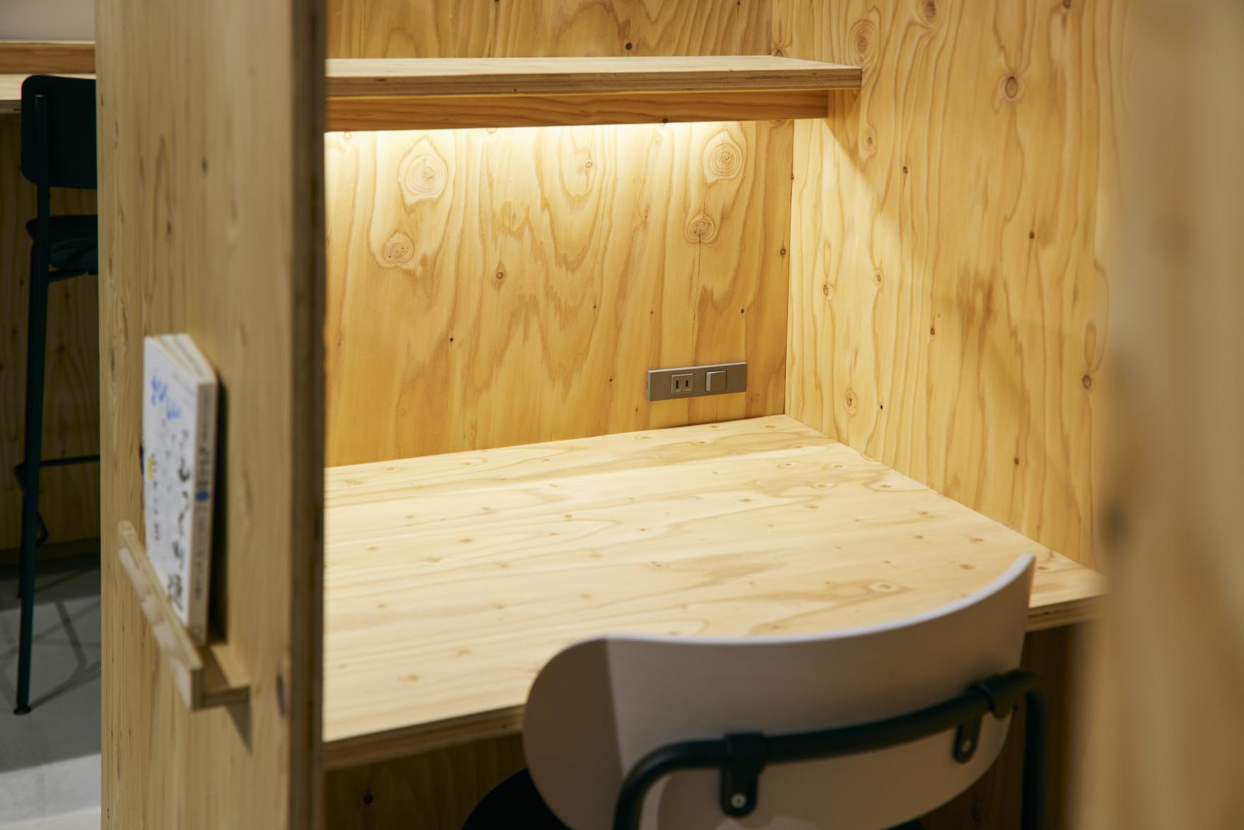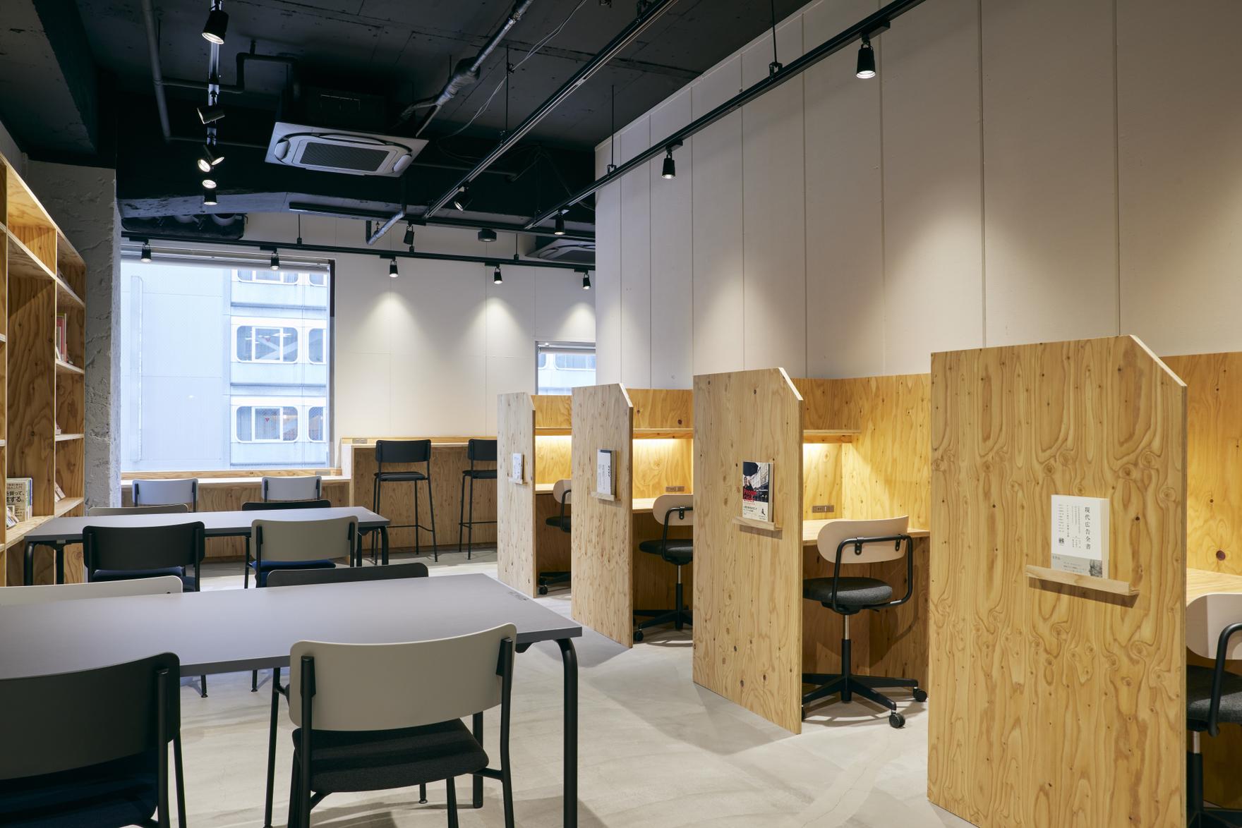 本棚やブース等の造作什器はラーチ材を使用し木材の表情を出し、個室壁面の石膏ボードの目地やビスもそのまま現し、内装のラフさもグッドノイズとして空間全体のトーンを生み出している。