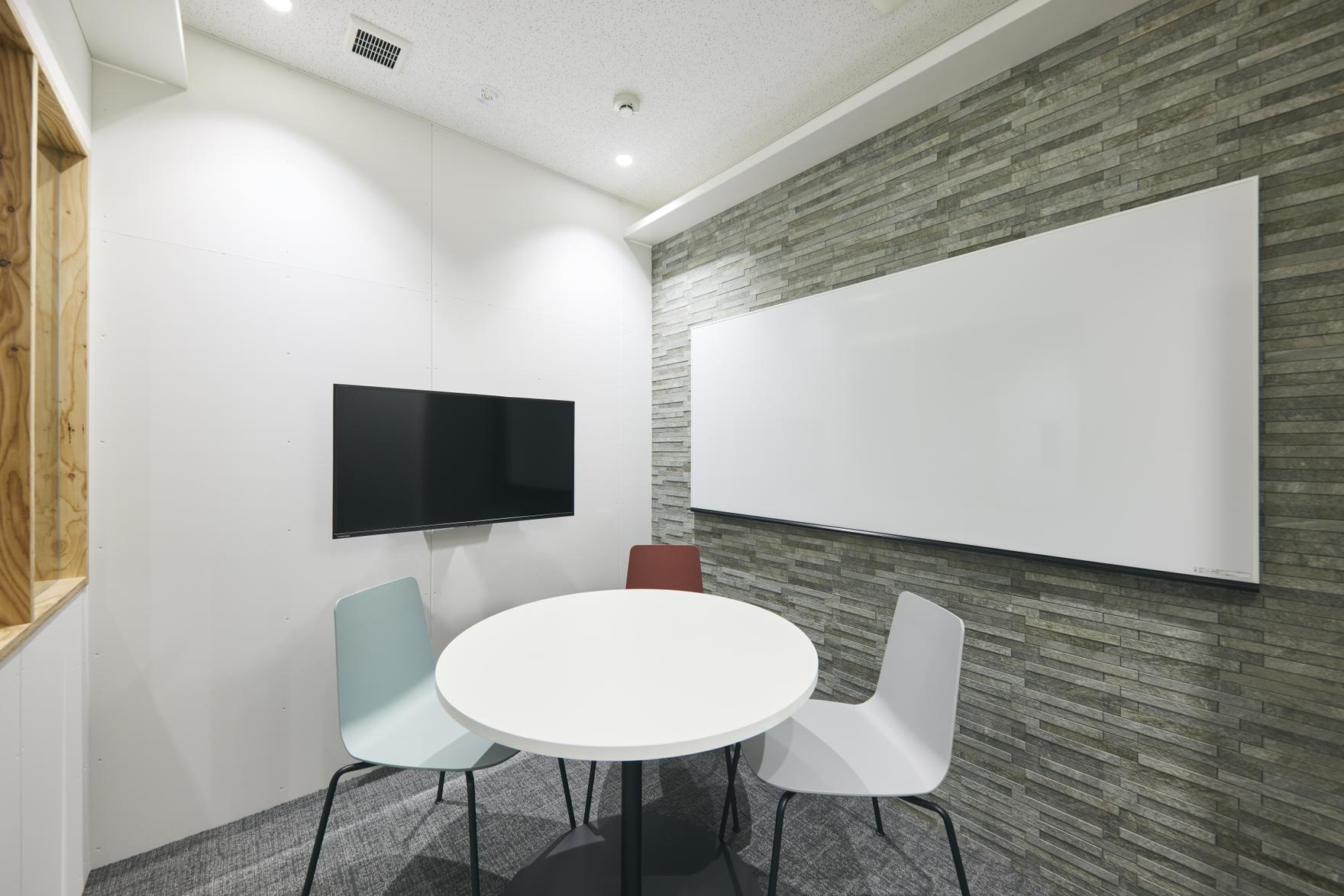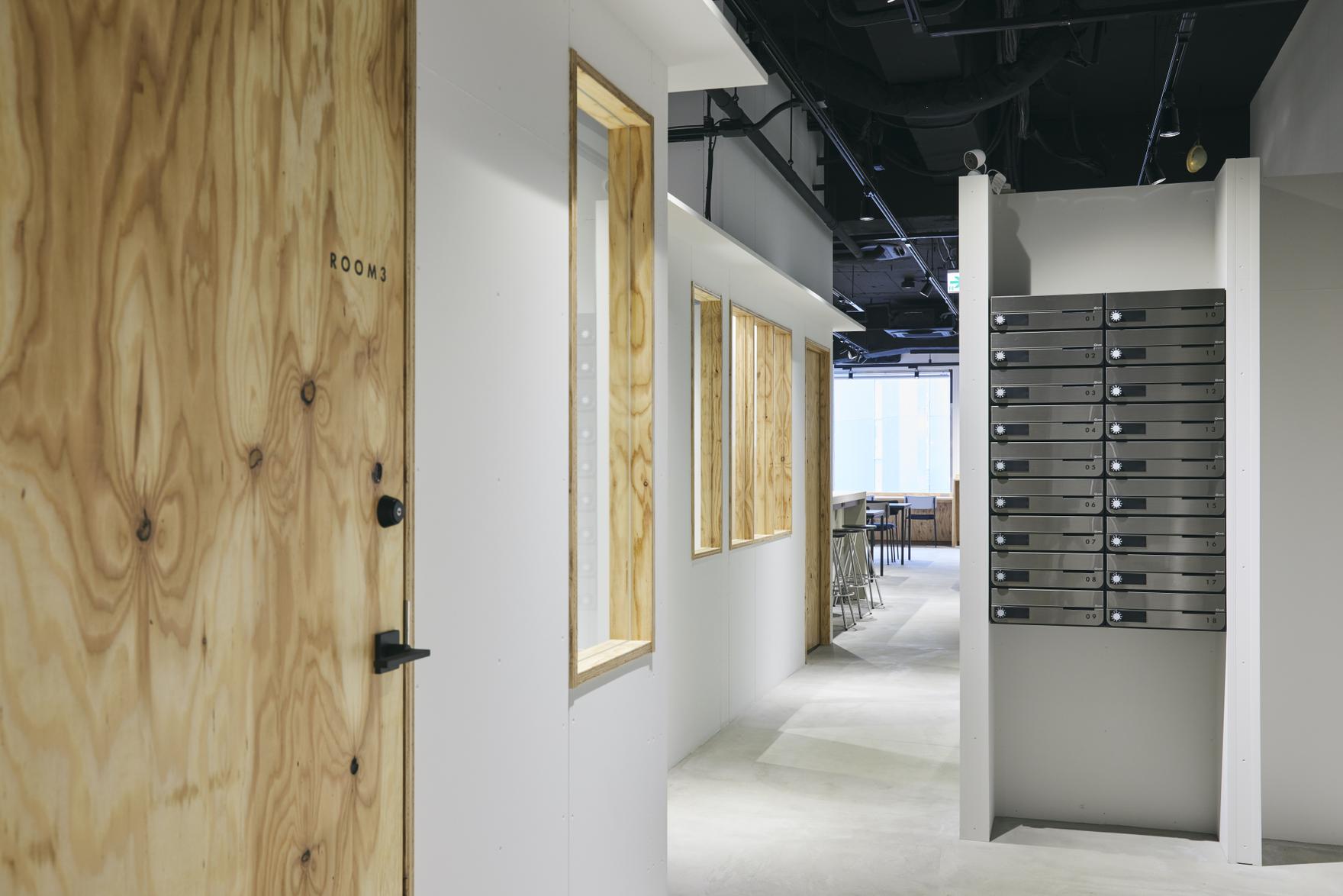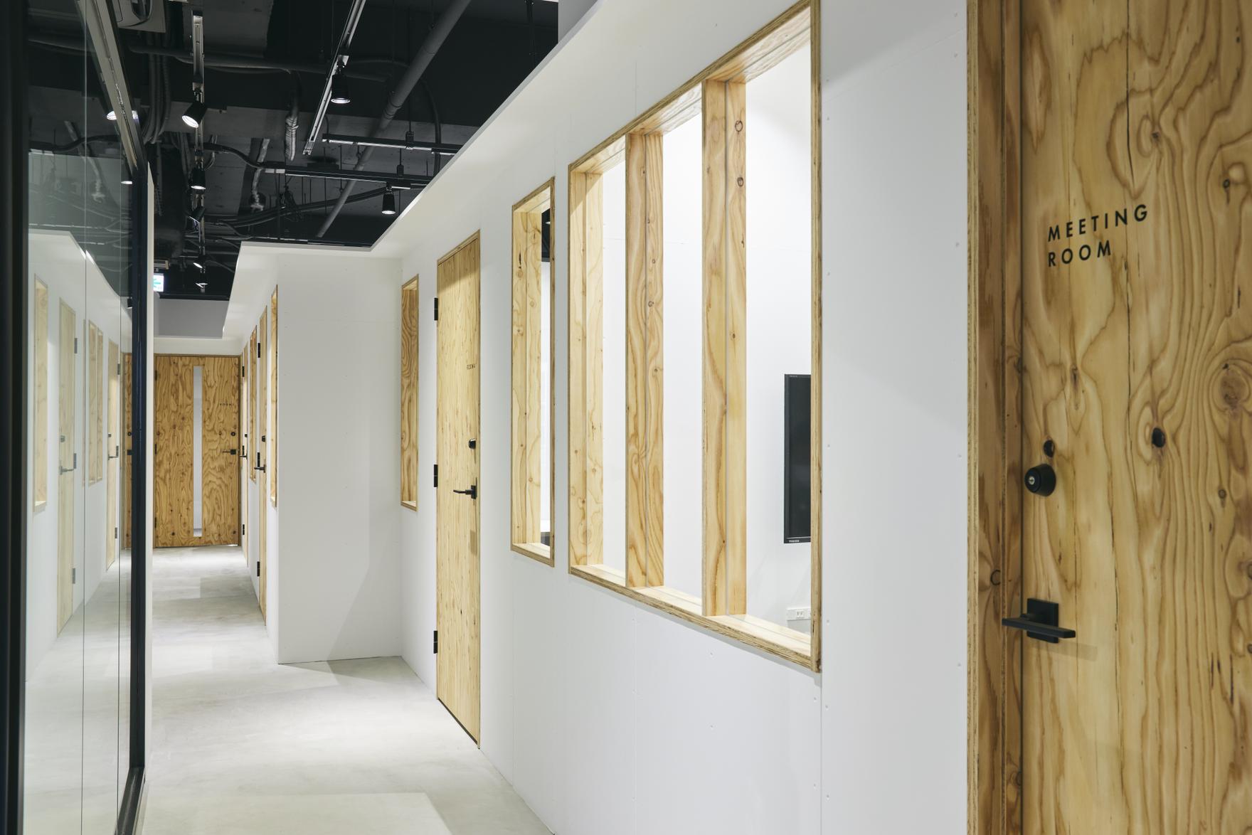 本棚やブース等の造作什器はラーチ材を使用し木材の表情を出し、個室壁面の石膏ボードの目地やビスもそのまま現し、内装のラフさもグッドノイズとして空間全体のトーンを生み出している。
