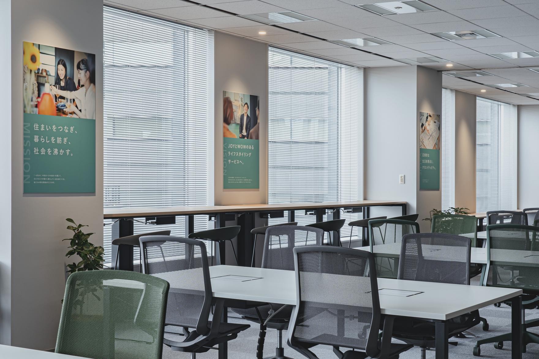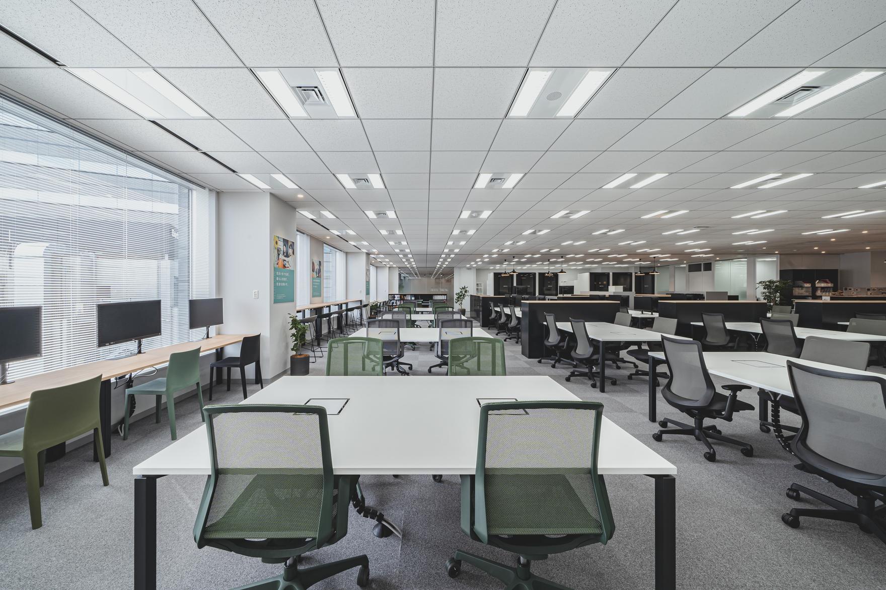 ワークスペースとしては「コミュニケーションを軸に一体感のある組織をつくる」というテーマを掲げ、オープンなワークスペースの中にコミュニケーションボードの設置やMVVを掲示し、組織としての一体感が感じられるように設計した。