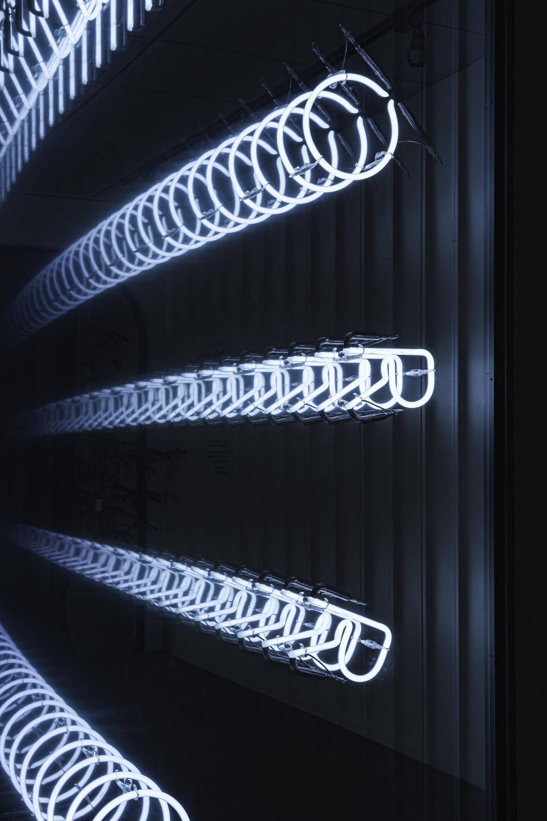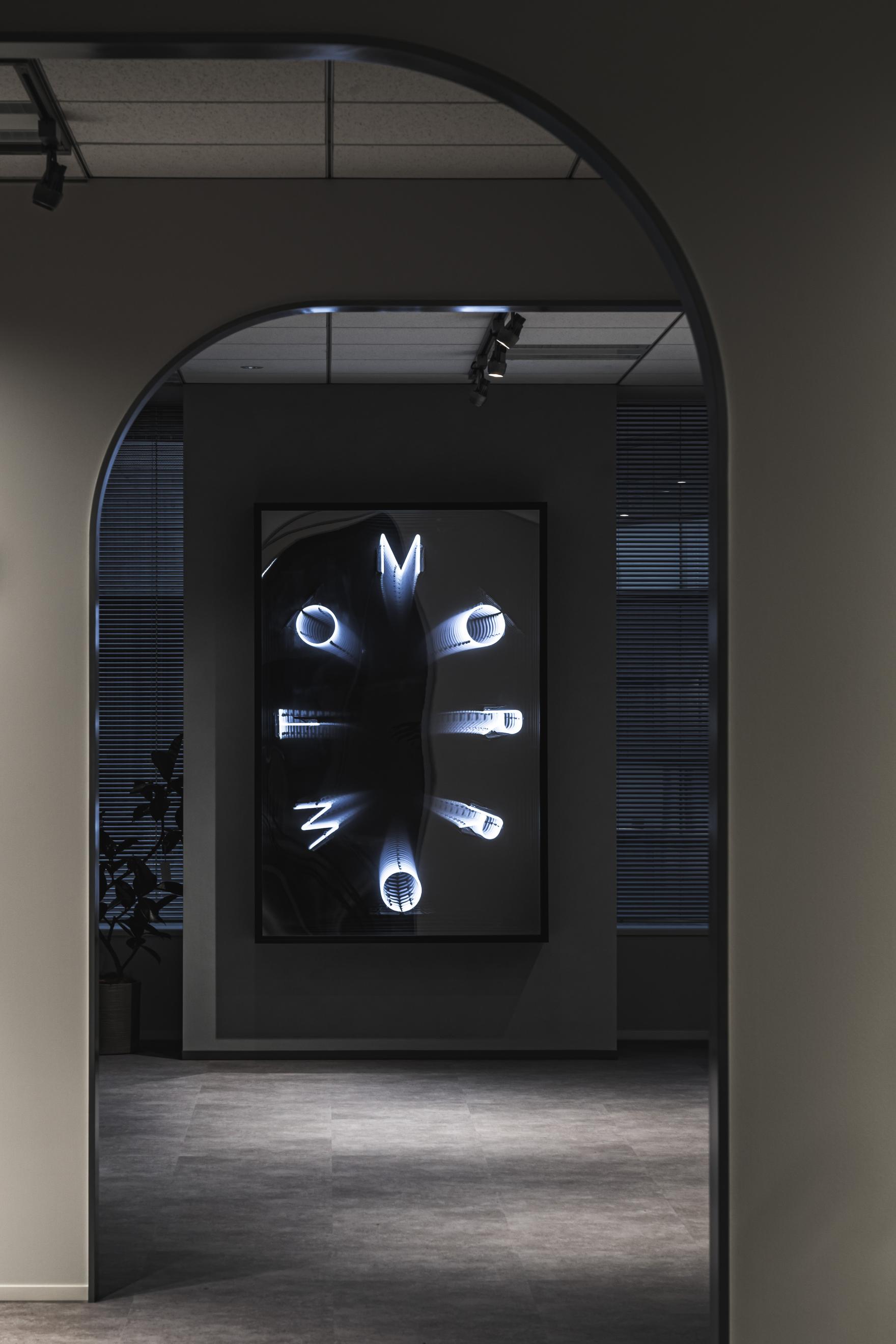 そして連続するアーチの壁の奥に、ライフスタイルは無限にあることをイメージした「TOMORROW」と書かれたミラーに無限に反射する象徴的なネオンサインを配置。