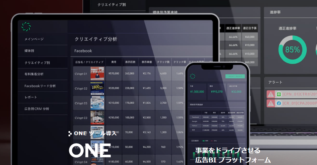 「ONE」は、様々な広告媒体の運用データとSFA/CRMデータを統合することで、LTVや最終CVなどに最適化をした広告運用を実現するツールです。リード獲得ではなくアポ取得、会員登録ではなくLTVなど、各企業が本当に追うべき指標に合わせてカスタマイズし、ご提供しております。