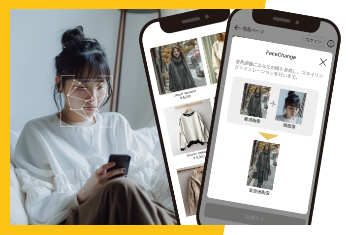 FaceChangeは、モデル着用画像の顔や、ユーザーと似た体型のスタッフコーディネート画像の顔をユーザーの顔に置き換え、自分に似合うか直感的に判断してもらうことができる、より個人的な新しいオンライン購入体験を実現します。