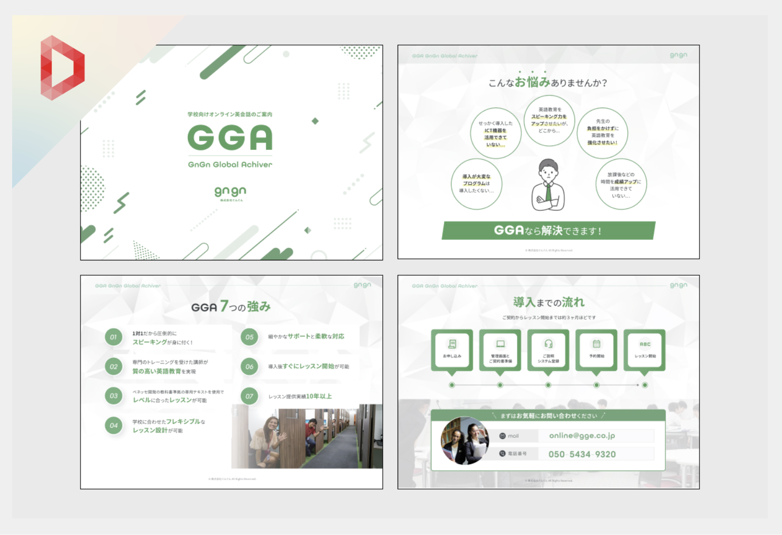 学校向けオンライン英会話の商材「GGA」を説明するための営業資料の制作をご依頼いただきました。内容の整理からお手伝いさせていただき、ページ構成企画、ライティング、デザインを行いました。 お客様である学校様のお悩みに訴求し、伝わりやすい資料にすることを心がけました。