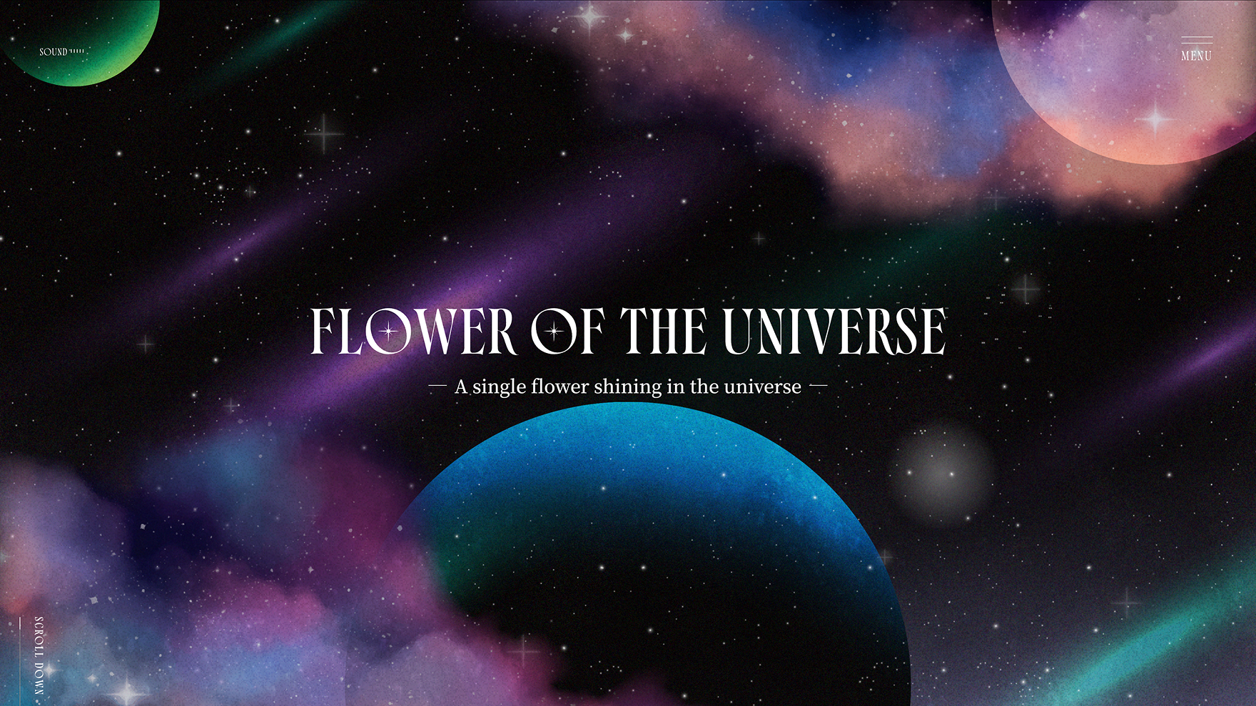 「FLOWER OF THE UNIVERSE」は、ファッション・ウェディング・フレグランスを軸に展開するブランド。ブランドの再始動に伴い、その世界観を最大限に表現するためのブランドサイトを制作。宇宙をテーマにした幻想的なデザインと直感的なUI/UXを融合し、ブランドの独自性を際立たせました。