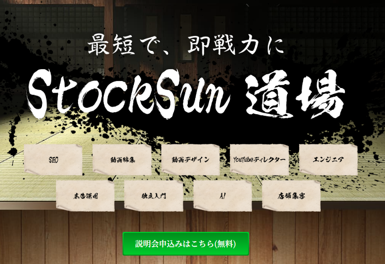 「StockSun道場」は、各分野で即戦力として活躍できるスキルを学べる実践型の教育プログラムです。営業・マーケティング・クリエイティブなど、分野ごとに専門スキルを磨ける環境を提供し、人材育成に力を入れています。