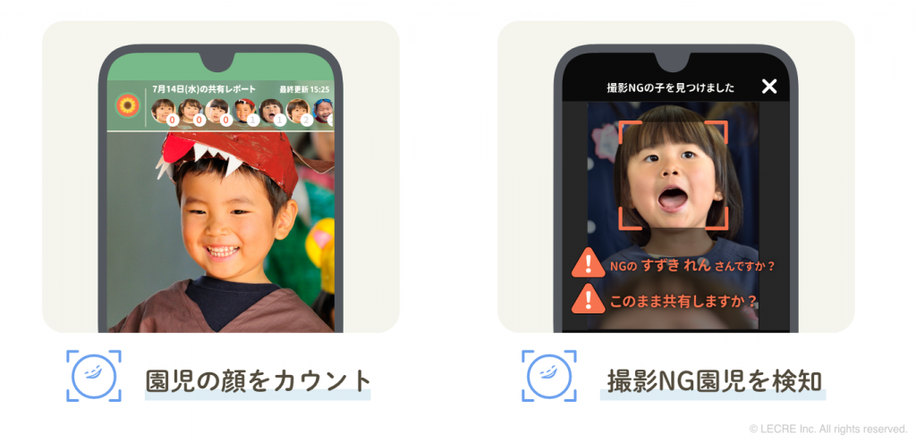 先生が撮った写真や動画を顔認識AIが自動解析し、園児ごとの偏りを防ぎながら効率的に共有。撮影NG園児の検知や保護者ごとの通知にも対応し、AIで共有の手間を大幅に削減します。