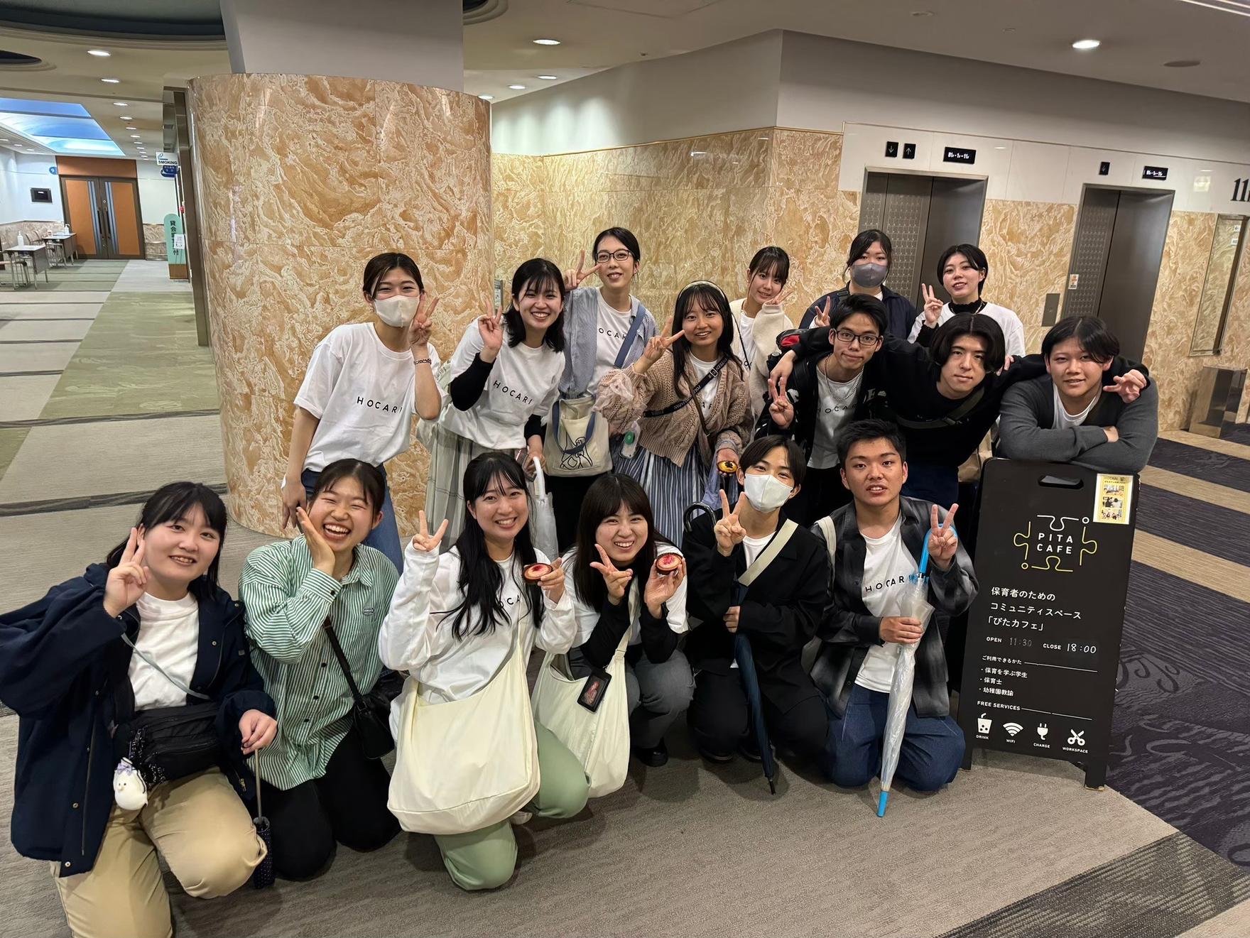 ぴたカフェでは保育学生と保育士が所属するNPO法人HOCARIも運営しています。 HOCARIでは保育学生が企画運営する合同就職説明会「HOCARI JOB」と、地域の子育て支援「おやこレク」を運営しています。