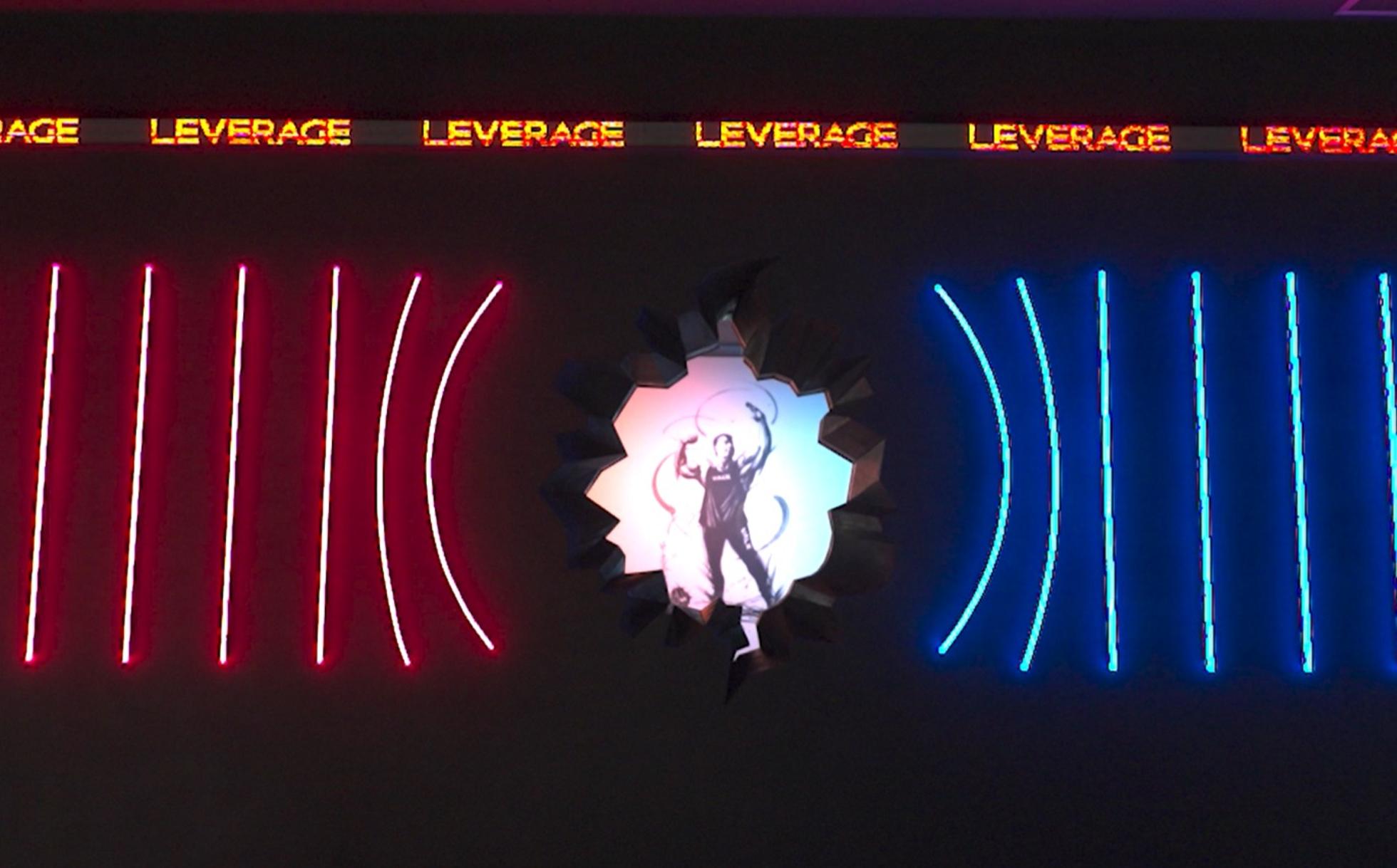 【オフィスコンセプト】オフィスは、当社のミッションである「前例のない熱狂を、しかける。」を表現するため、「WOW!」をコンセプトに設定しております。前例のない取り組みを行うには、「冷静と情熱」の両方が必要です。フロア内は、この2つを象徴する青と赤のRGBライティングで表しています。印象的なエントランスは、壁に開けられたポリゴン状の穴が、多くの障害を乗り越えて拡大してきた当社の突破力を映し出しました。