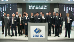 毎年行う「経営計画発表会」の様子です。取引先の金融機関や、パートナー企業の皆さまをお招きし、今後の経営方針を発表するものです。