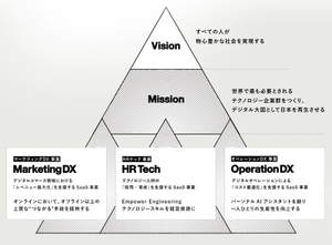 企業ビジョン・ミッションの実現に向けて、「HR」「レベニュー」「コスト」の3領域で“デジタル化促進”に寄与する事業を展開しています。