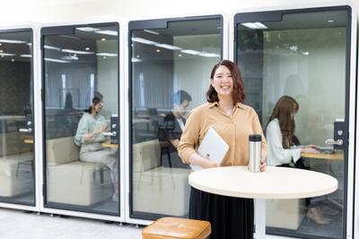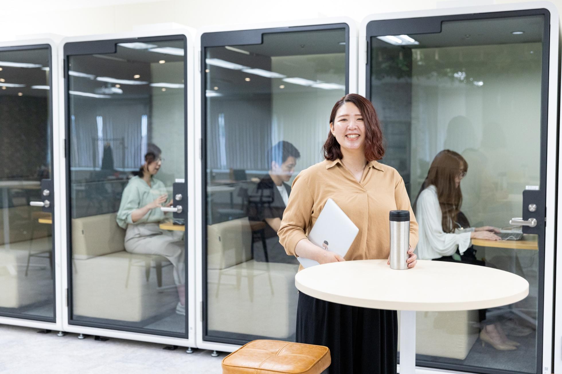 本社オフィスにはWORKPODを多数設置しており、防音なのでオンラインのミーティングも問題なく実施できます!社内はフリーアドレスで自分の好きな場所で働くことができます。