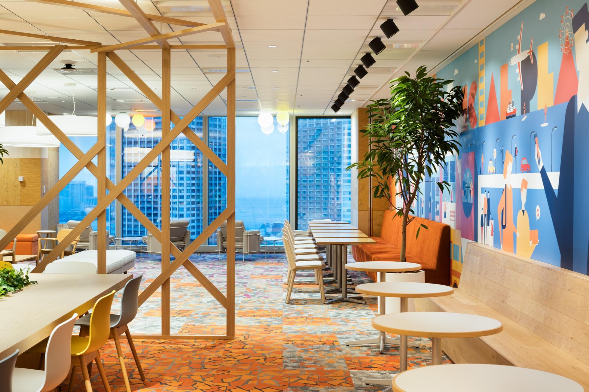 社員の憩いの場、リフレッシュルーム。写真では伝わりにくいですが100名規模のイベントができるゆったりとしたスペースで社員が休憩したり談笑しています。