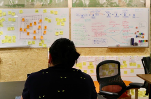 下北沢の地下にある秘密基地のようなオフィスには、プロジェクトに関する模造紙や付箋がたくさん張り出されていて、メンバー同士の会話のきっかけにもなっています。