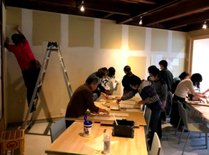 2020年2月には、島根県雲南市に子会社を設立。空き家を活用した施設を地域住民と共に創出します。写真は、施設の壁に地元で作られた和紙を住民の方々と一緒に貼るワークショップ。