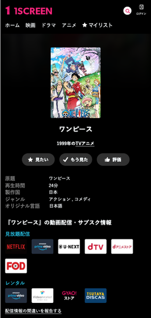 『ワンピース』の配信情報を1Screenで検索(https://1screen.tv/jp/tv/8621 )