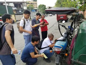 フィリピン、韓国、日本の技術者で車両解析している様子